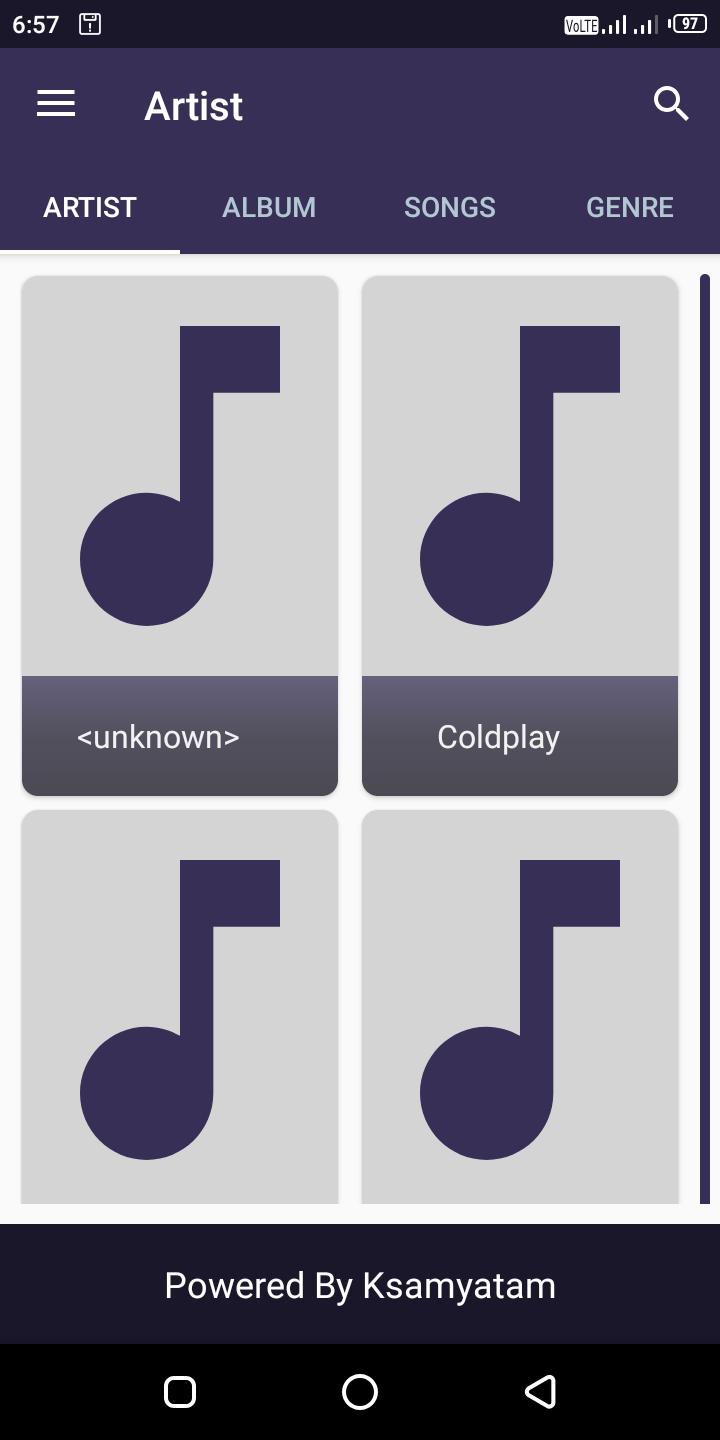 - 4 tabs: Artist,Albums,Songs,Genres.