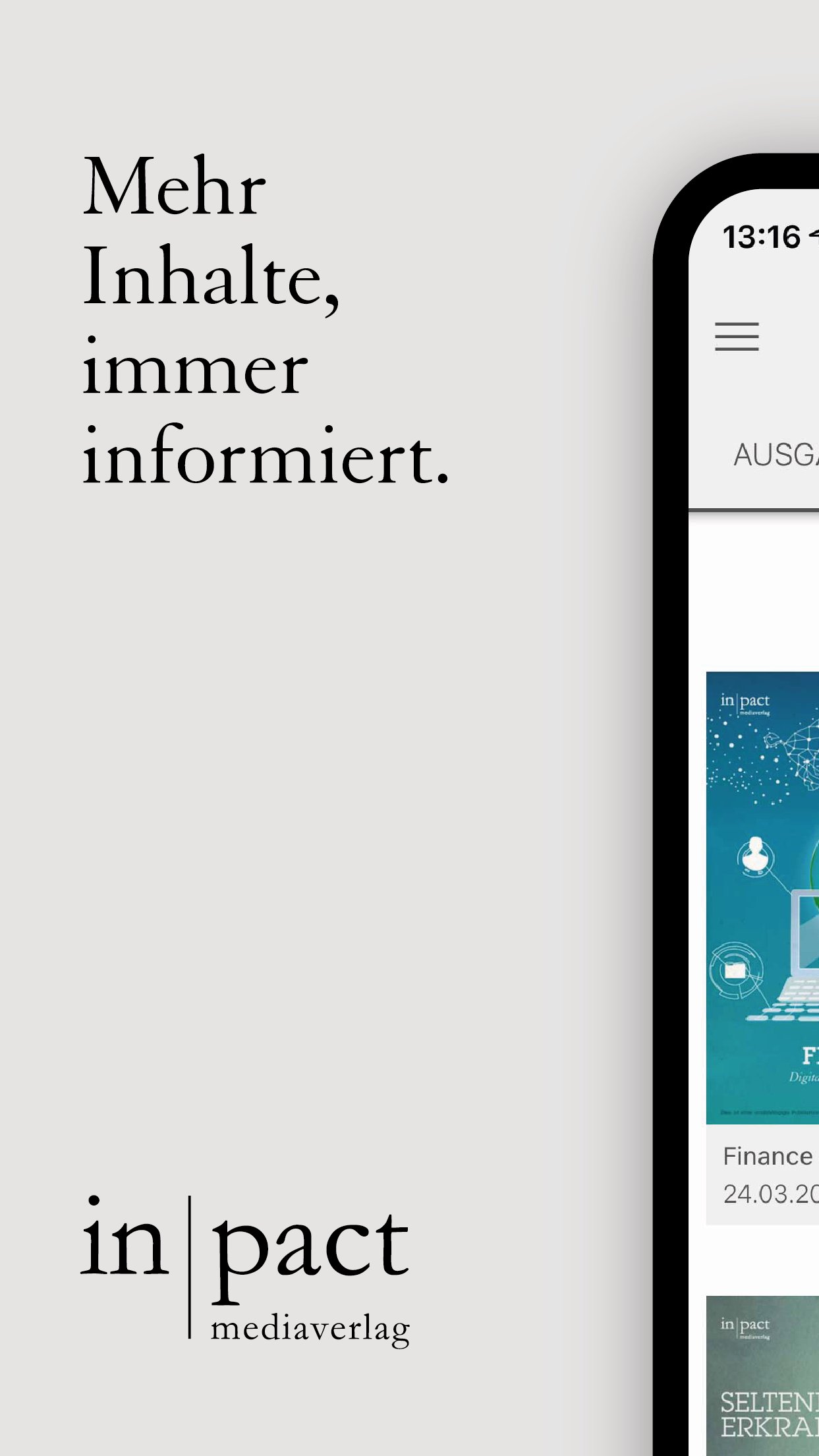 With this app you have free access to all topic publications of the in | pact media publishing house. The magazines appear at regular intervals as supplements in well-known daily and weekly newspapers such as the Handelsblatt, DIE ZEIT and Die Welt as well as in the largest business magazines in Germany (CAPITAL and WirtschaftsWoche). They shed light on current trends and developments in business, IT, technology, medicine and lifestyle. The eMagazines are also enriched with attractive multimedia content such as videos and photo spreads. Features such as "plain text" or the gallery function, with which you can scroll through the images and call up the relevant article from there, provide easy access to the publications. The "Text-to-Speech" function makes our print products accessible and is the digital reader for cars, bicycles, the beach and the sea. It can be used offline and reads all articles that are available as text. Extensive share functions allow sharing with friends and colleagues via Twitter, Facebook and YouTube.