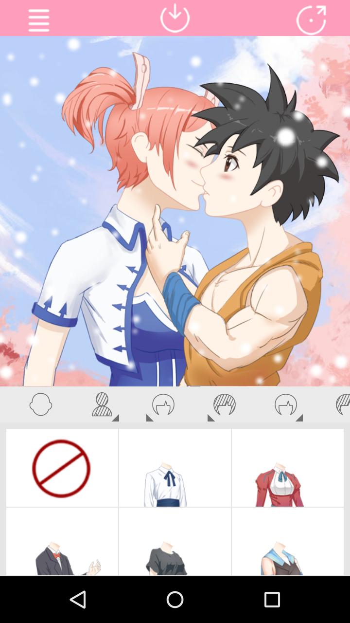 app that can create anime kissing couple character. You can create anime couple by yourself from anime maker features. A kiss can express sentiments of love, passion, respect, greeting, friendship, and good luck, among many others.