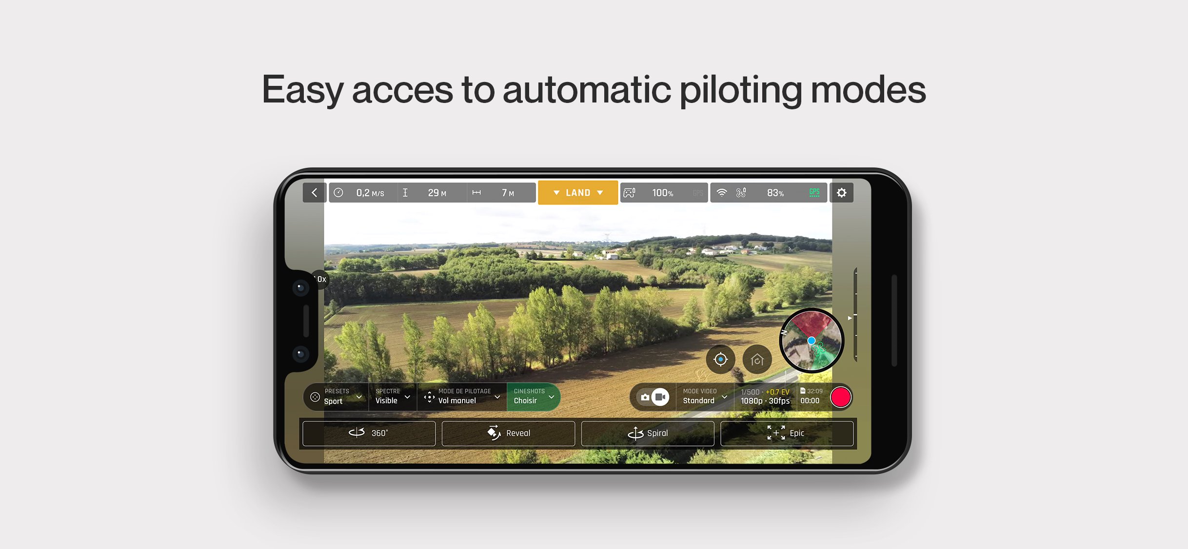 FreeFlight 6 offers a smoother and more intuitive piloting experience for ANAFI users everywhere thanks to a modernized interface. The application boasts ease of use; you can now quickly access exciting features directly from the home screen. The flying interface is adaptable to all users; beginners can have fun with dronies and automatic flight modes, while professional photographers can choose between several advanced and personalized camera settings.