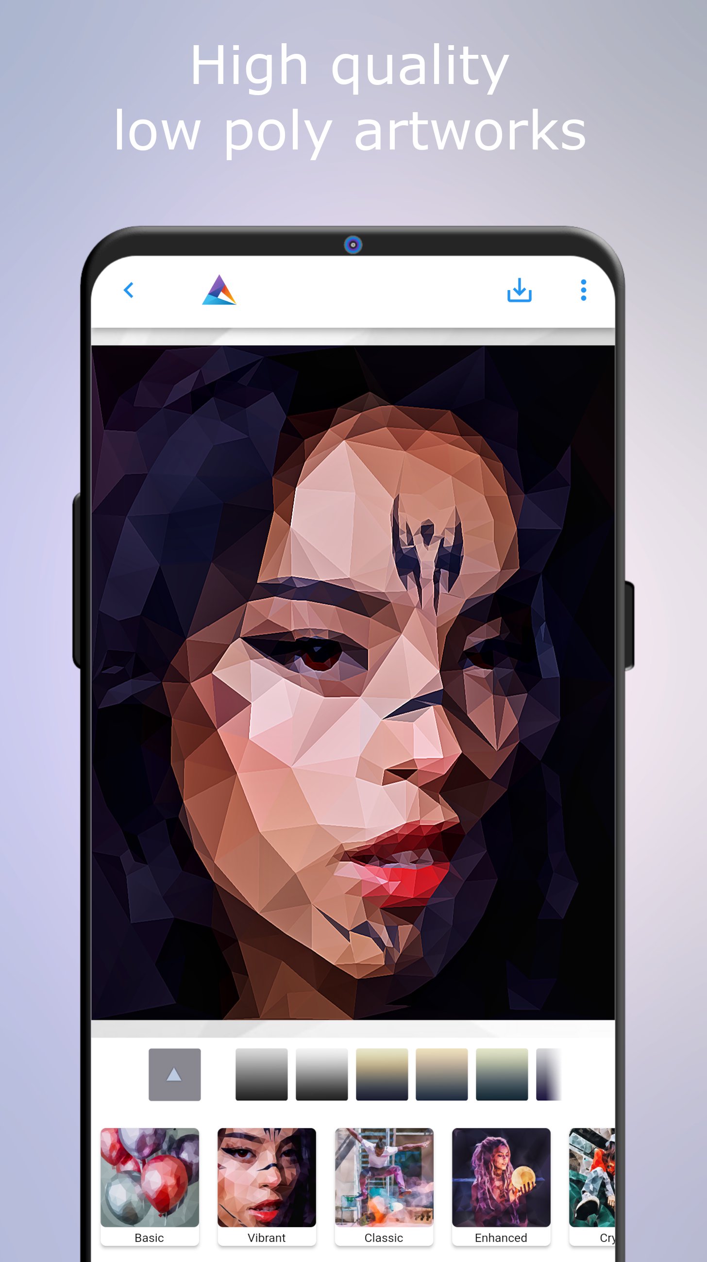The editor automatically generates high-quality low polygonal artwork from your photos, allowing you to customize: