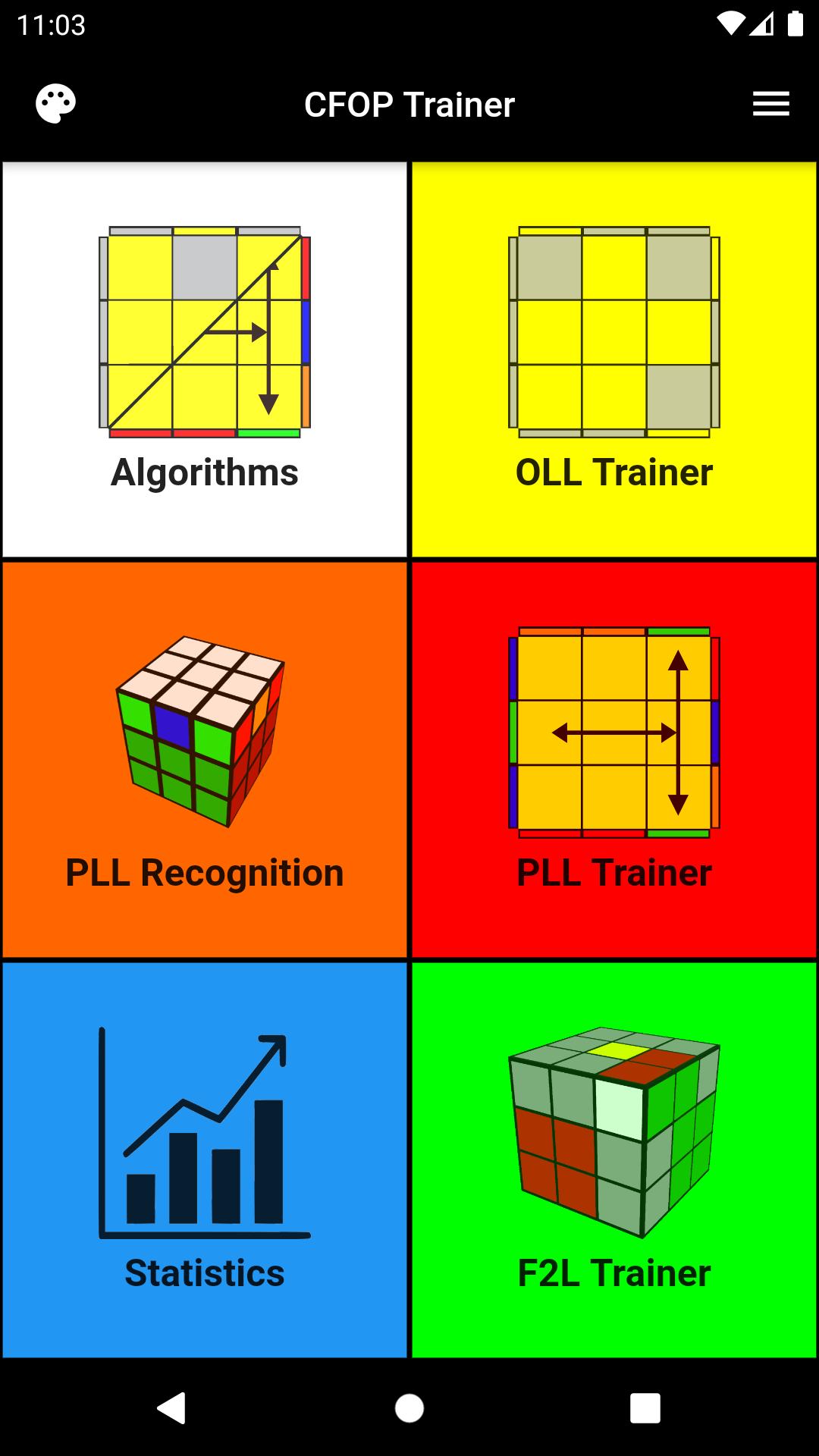 VivaLabs presents CFOP Trainer, a tool to help you leaning and train CFOP. This app has a 2-sides PLL recognition, F2L, OLL, PLL, COLL and WV Trainer. statistics and a reference table for: the 41 F2Ls, 57 OLLs, 21 PLLs, 41 COLLs and 27 WVs.