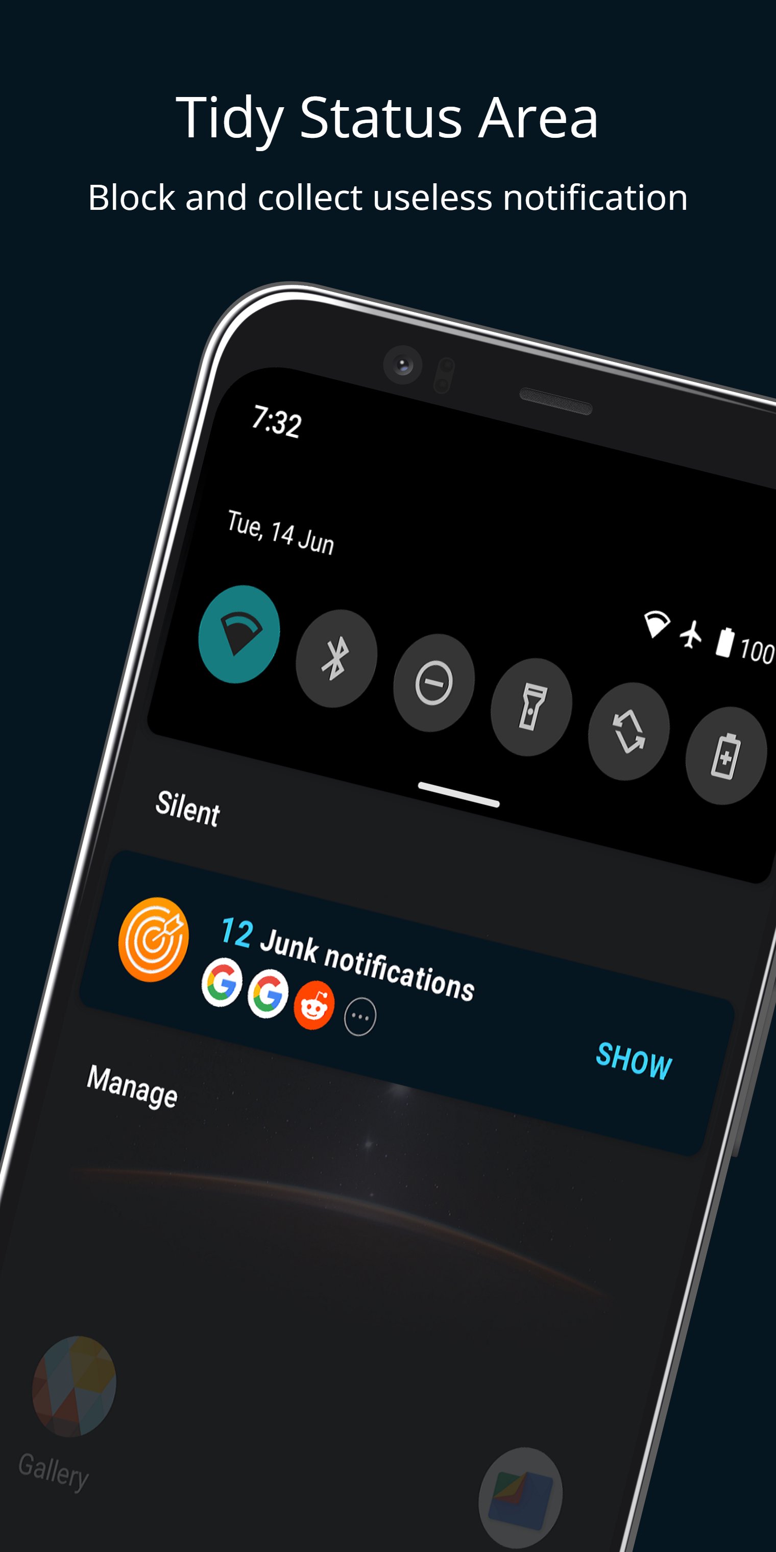 Useless notifications will be blocked smartly and collect in one place, so the phone notification bar will always be in a clean and tidy status. The app stops trash notifications from jamming and slowing down your phone, keeping your phone free from disturbing and annoying notifications.