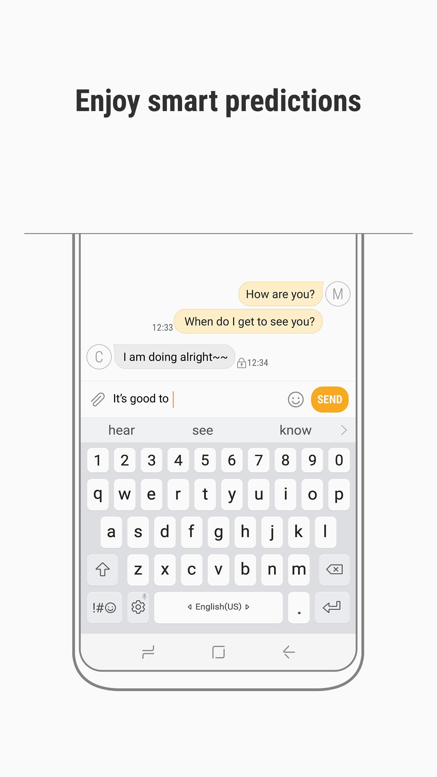 - Predictive text: Learns how you type and recommends words and phrases as you type. The recommendation feature will perform better based on the data Keyboard For Samsung gathers for each user.