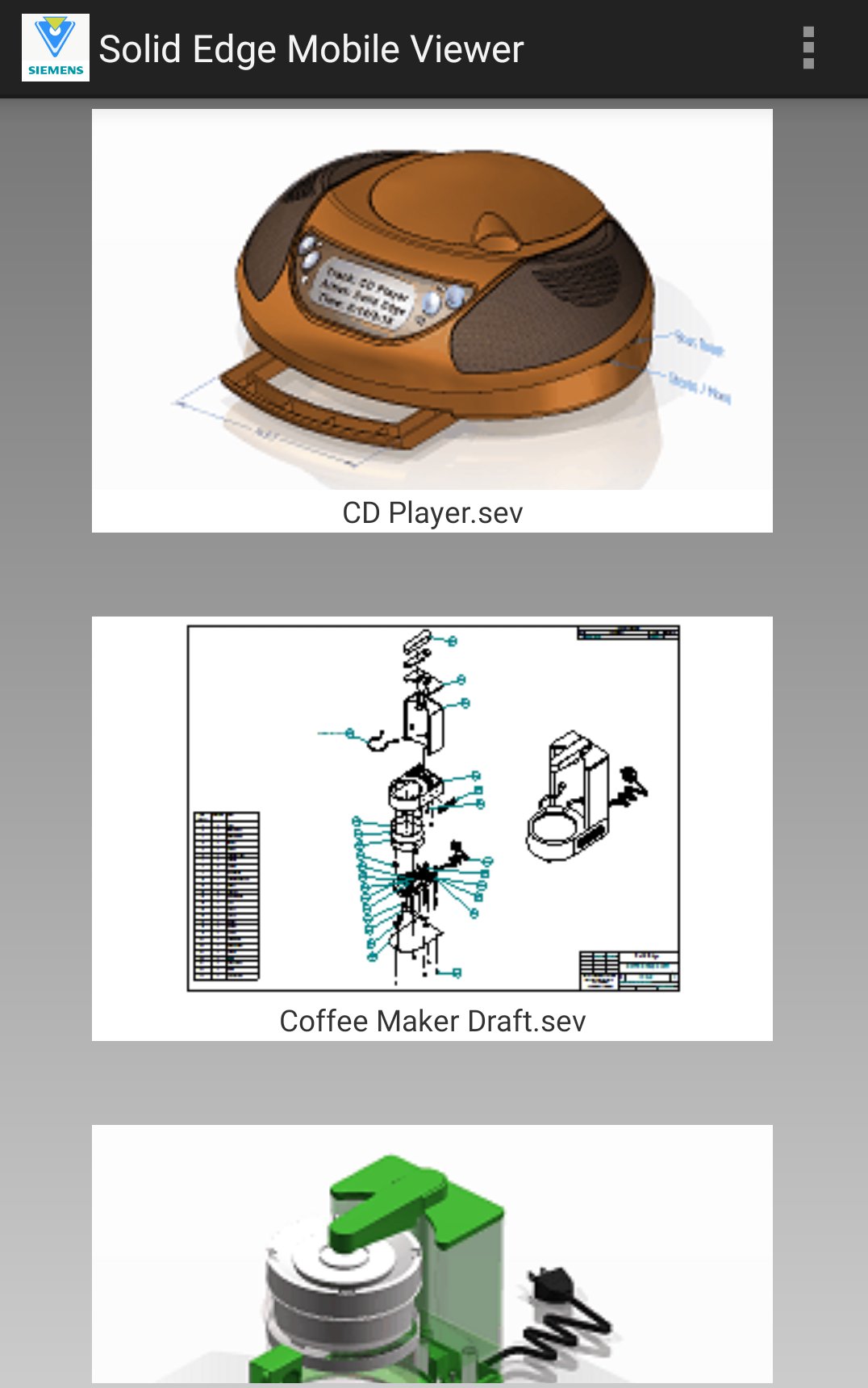 Solid Edge Mobile Viewer, proveniente del desarrollador Siemens Digital Industries Software, se ejecuta en el sistema Android en el pasado.