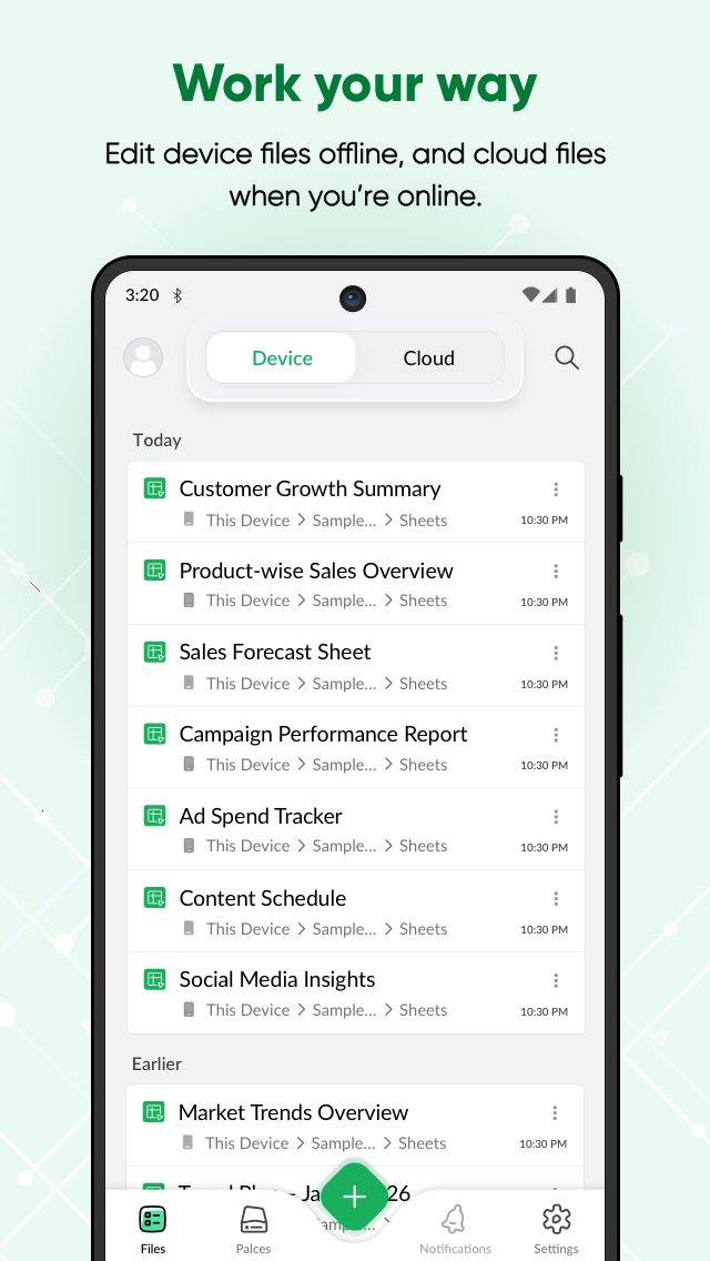3. Open and edit MS Excel files (XLSX, XLS, XLSM, and XLTM), as well as CSV, TSV, ODS, and more stored on your device and cloud apps like Box and DropBox.