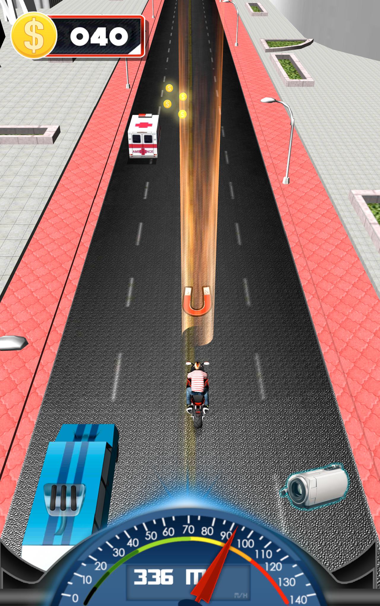 Increase your speed as much as you can to earn extra points.This game gives you a chance to do something that can not be done in real life traffic.Choose your favorite sports bike and get ready for unlimited fun on the road. This time there is no traffic rule to following.Ride your bike like a free bird and fly on road like a jet plane. Collect as many coins as you can to upgrade your bikes and buy amazing upgrades.