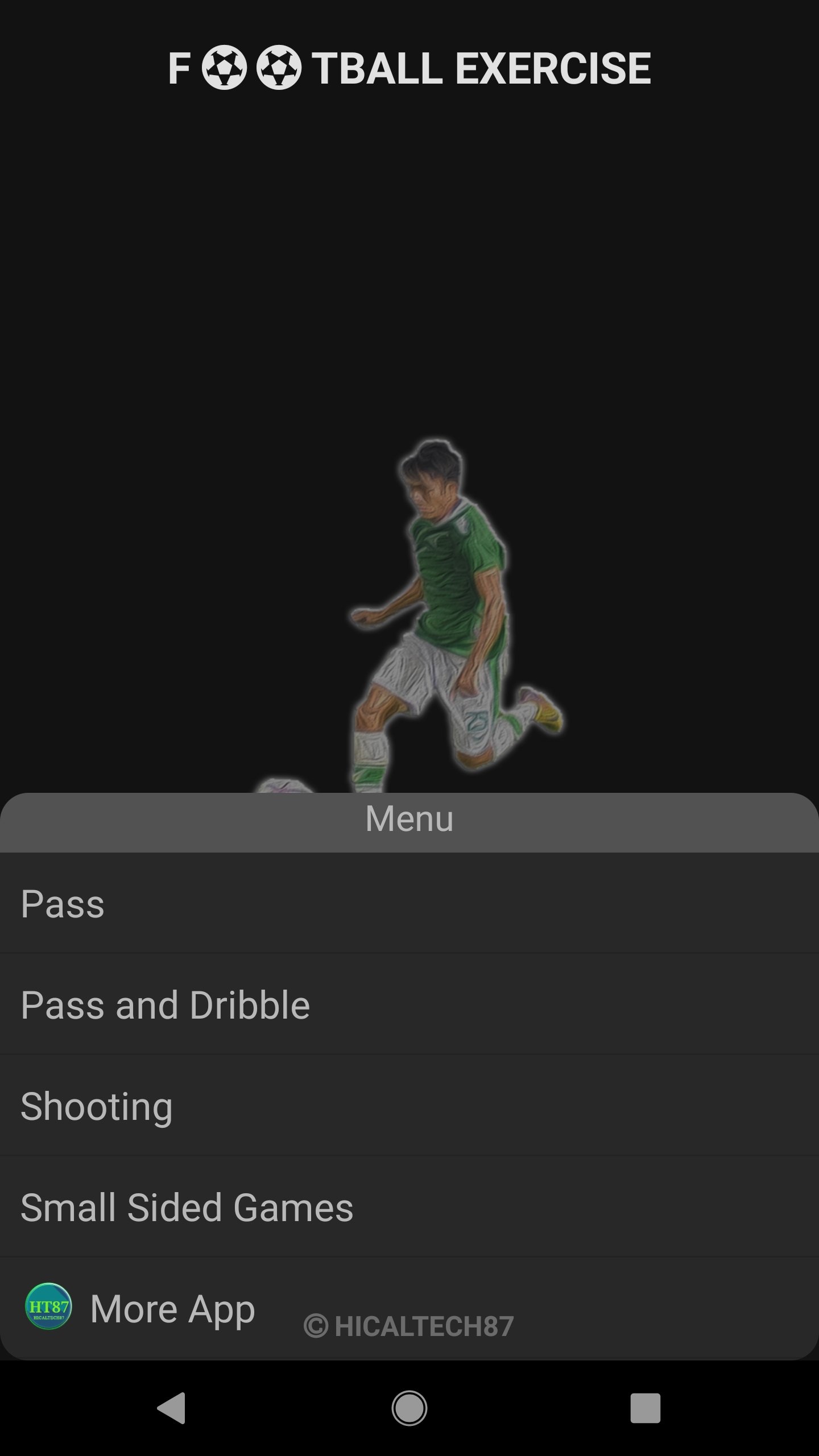 In this app, you will find 4 part of exercises which is passing exercise, combination exercise passing, control, dribbling, shooting exercises, small side games exercises.