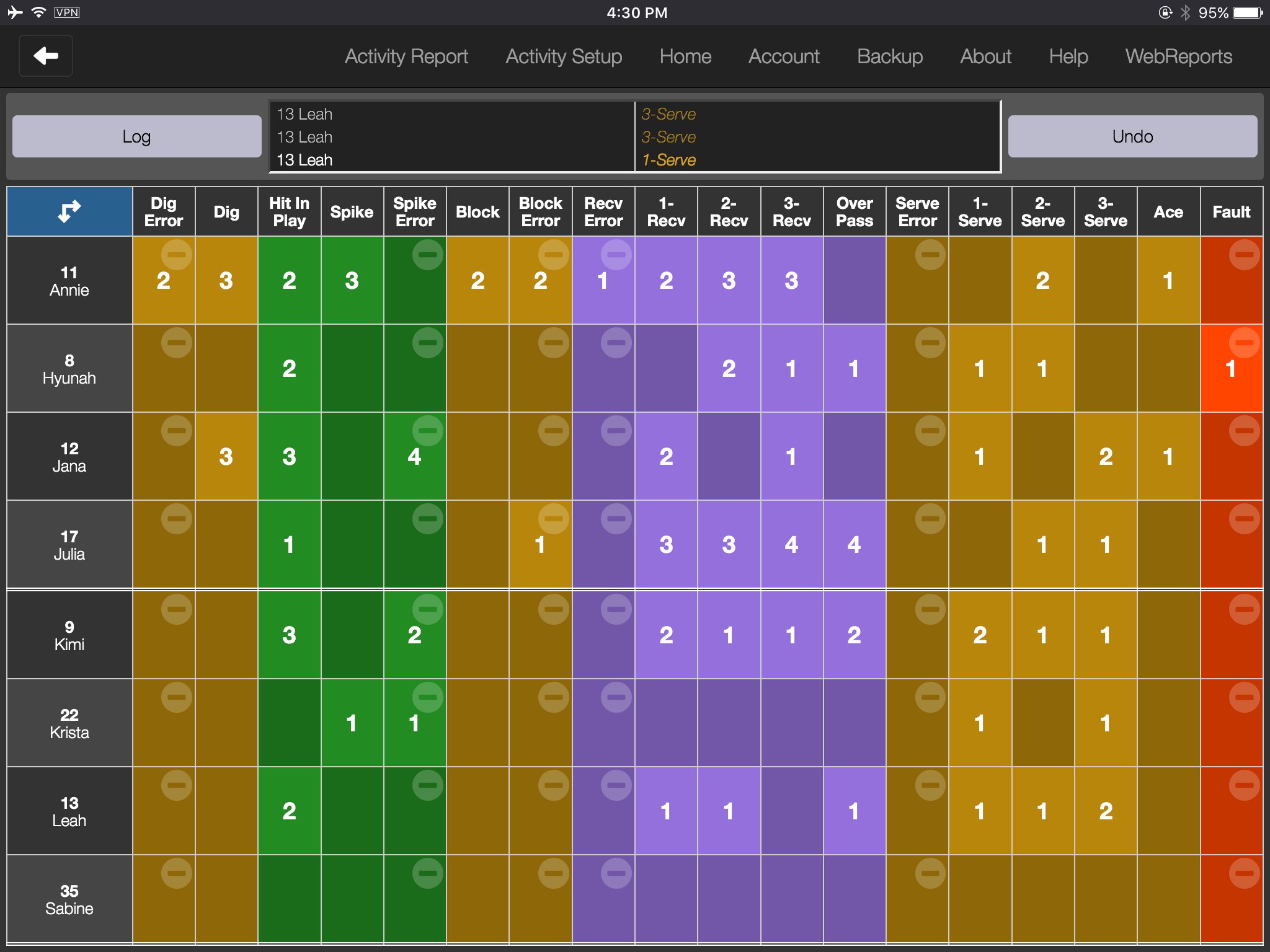 Press the cell in the spreadsheet-like grid to update the touch count. You have immediate access to reports from this view to see how each player is doing. SoloStats Clipboard like all SoloStats LIVE, 123 and Touch is completely free for stat taking. Backup your stats to WebReports to see aggregate reports and analyze your stats.