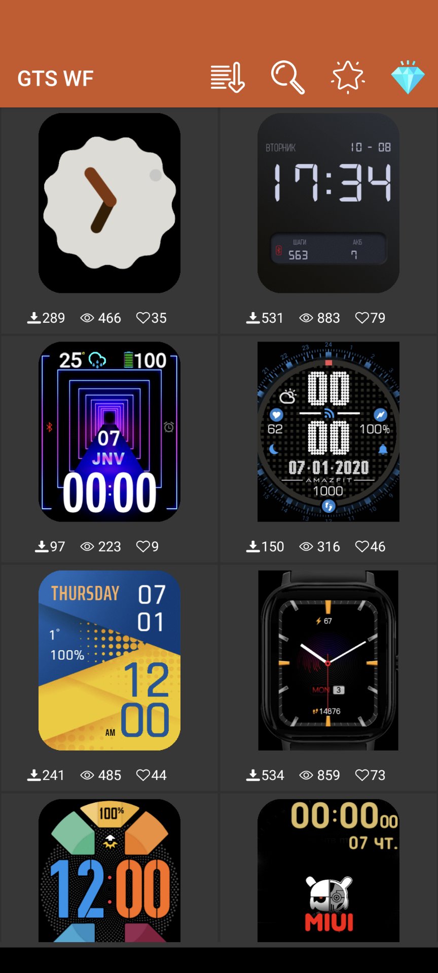 Users can download, add to favorites, search, filter, sorting watch faces.