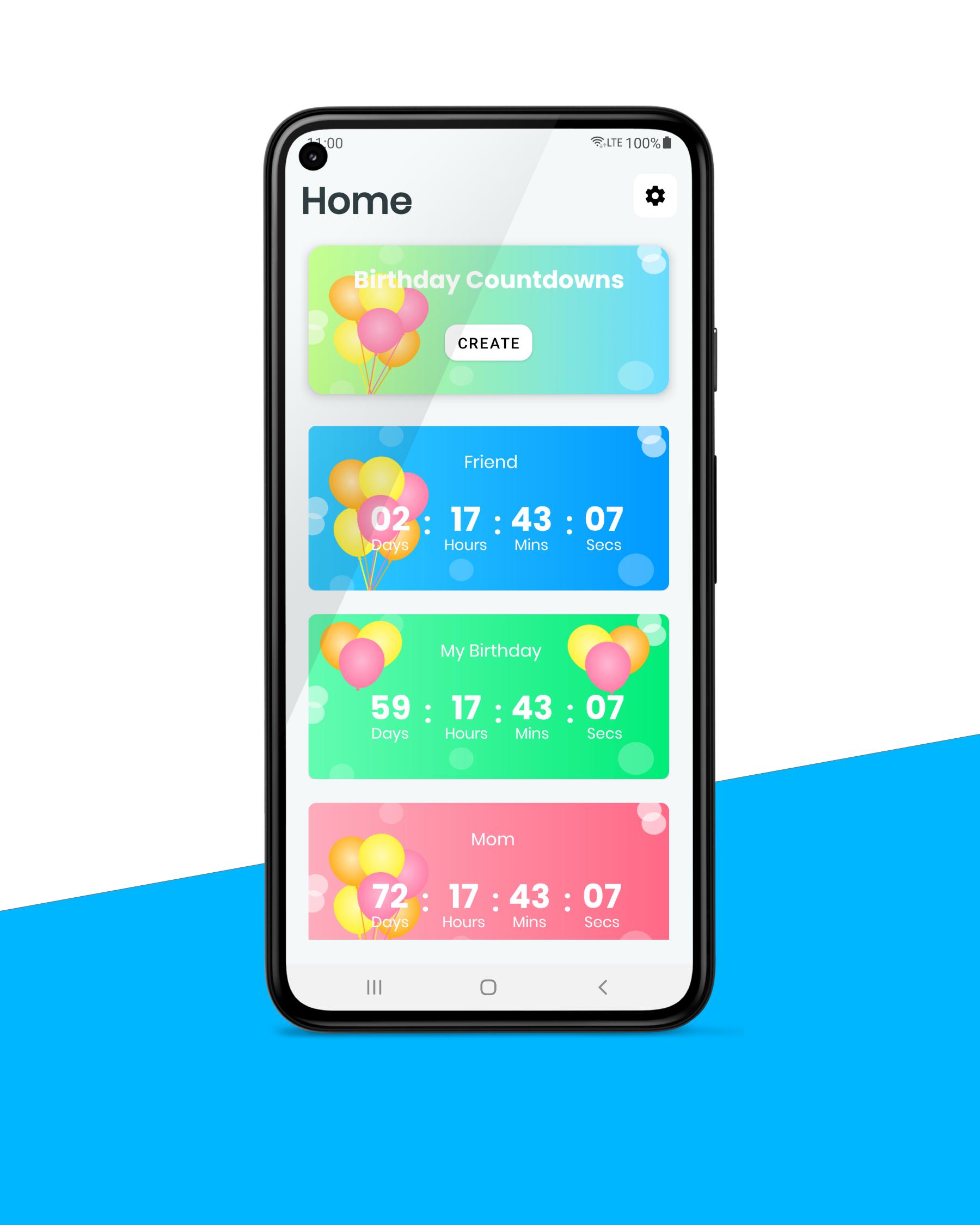 In-app you can tap on the create button and navigate to the creating activity. You can type a title for your birthday and select your birthday in the calendar. Also, you can set a custom time. After that, you can select the background color for your birthday and select the text color for the birthday on the main page.