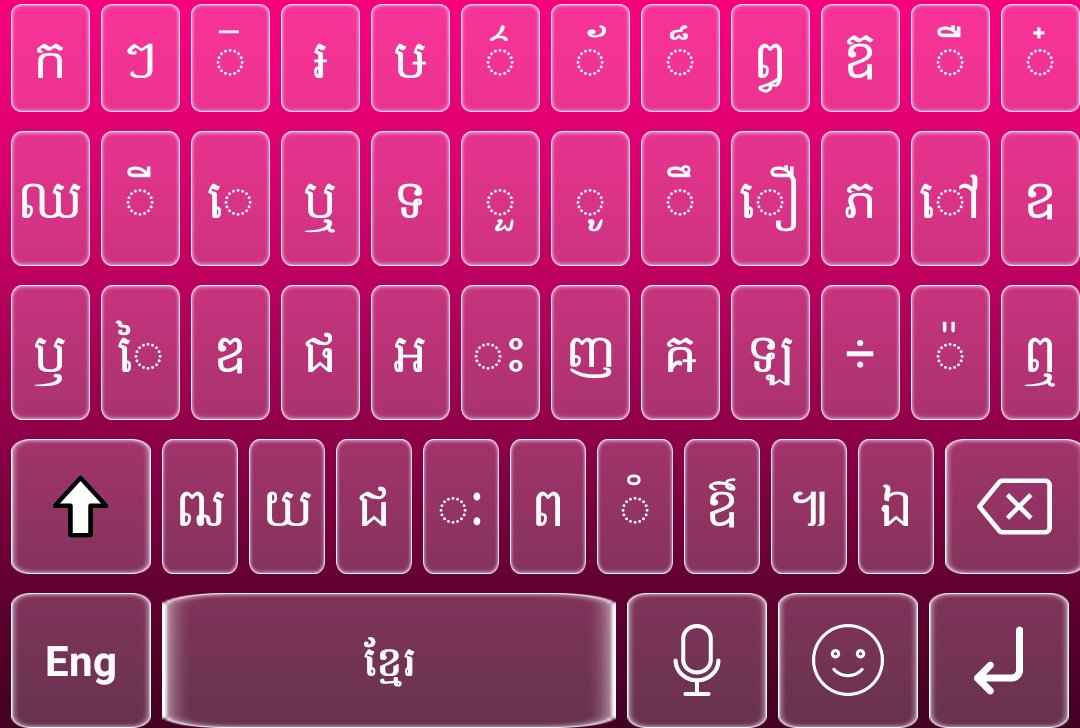 Khmer Voice Keyboard: Our Khmer Voice Typing Keyboard have standard keyboard size and have all Khmer Alphabets like a Khmer Standard keyboard. Khmer Smart Keyboard works smartly to manage Khmer English keyboard with 2 languages at same time. Moreover, Khmer Voice typing keyboard will type through Voice input using Khmer Voice keyboard. Khmer keyboard 2021 have many amazing features like type Cambodia Language Keyboard with sound on keypress, Cambodian keyboard with vibrating and on the Top, Khmer keyword Suggestions in Khmer color keyboard 2020. Khmer Language keyboard with Khmer English Typing keypad to make Khmer smart keyboard use as Khmer standard keyboard. Easy Khmer keyboard have latest emojis and HD stickers to make Khmer language more expressive and Cambodian Keyboard a Khmer Standard Keyboard. Khmer Language keyboard is free Khmer keyboard 2021 with smooth Khmer typing keyboard.