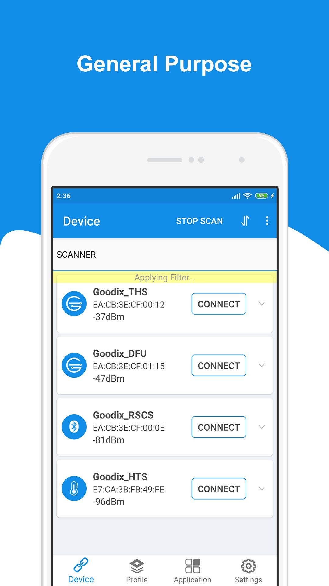 • Scanning devices (with filter and can list devices with signal strength from the highest to the lowest)