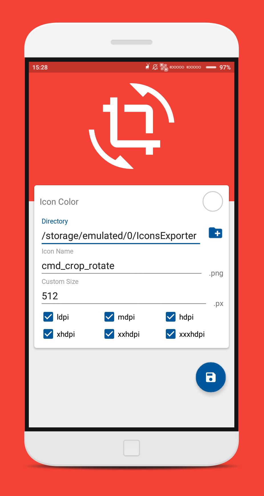 Exporter android icons library to png file. Very usefully to android application icon, and simple and easy. You can export icons with multiple in several resolutions at once. Icons Exporter includes a staggering amount of free icons - over 5,000 - ready for you to use, including the following amazing icon sets: