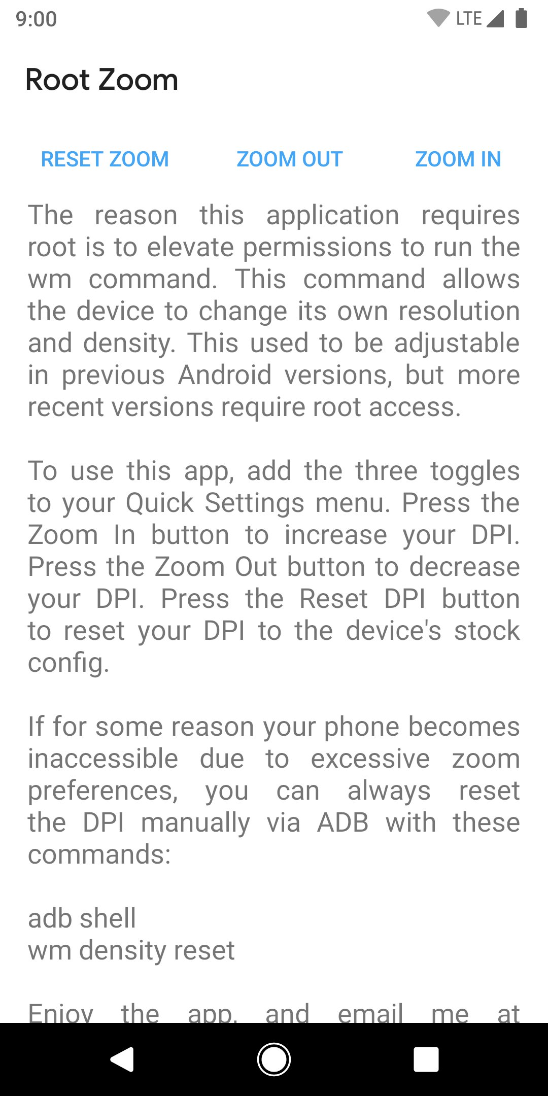 To use this app, add the three toggles to your Quick Settings menu. Press the Zoom In button to increase your DPI. Press the Zoom Out button to decrease your DPI. Press the Reset DPI button to reset your DPI to the device's stock config.
