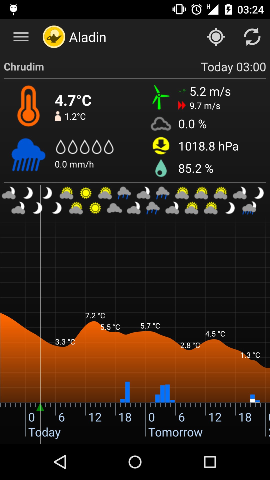 Již nemusíte pravidelně sledovat zprávy v televizi, předpověď na internetu či cokoliv dalšího. Aladin je tu pro vás s nejaktuálnějšími předpověďmi a změnami počasí. Díky aplikaci Aladin můžete být kdekoliv a kdykoliv informování o všech podstatných informacích, jež vás ve spojení s počasím mohou napadnout.