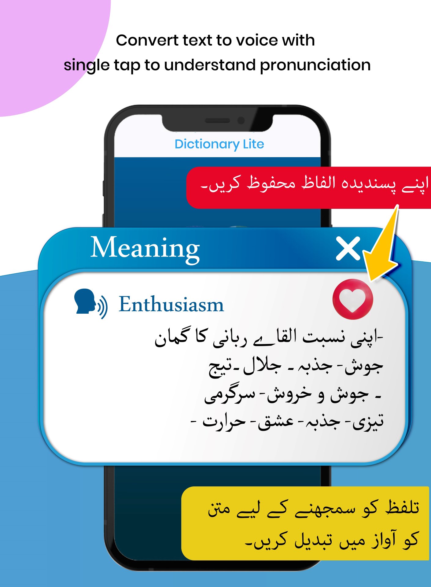 Walaupun Kamus Inggeris lite tidak memberikan definisi perkataan luar talian. Walaupun kamus lite luar talian tidak memberikan sinonim perkataan atau sebarang contoh. Mekanisme aplikasi kamus mudah difahami maksudnya. Kamus Inggeris ke Urdu luar talian 2024 ialah aplikasi yang sangat mudah dan mesra pengguna. Aplikasi kamus Inggeris ke Urdu menyimpan setiap perkataan yang anda lihat dalam sejarah. Kamus Inggeris ke Urdu di luar talian percuma anda boleh menambah perkataan pada senarai kegemaran anda dengan mengklik ikon "bintang". Kamus Bahasa Inggeris Urdu mengurus sejarah dan senarai kegemaran, dan anda boleh mengedit atau mengosongkan senarai ini. Dictionary Lite di luar talian Anda boleh menukar fon dan tema aplikasi (pilih salah satu daripada beberapa tema warna). Anda boleh menterjemah aplikasi kamus Inggeris ke Urdu melalui modul pertuturan suara (tidak memerlukan sambungan internet).