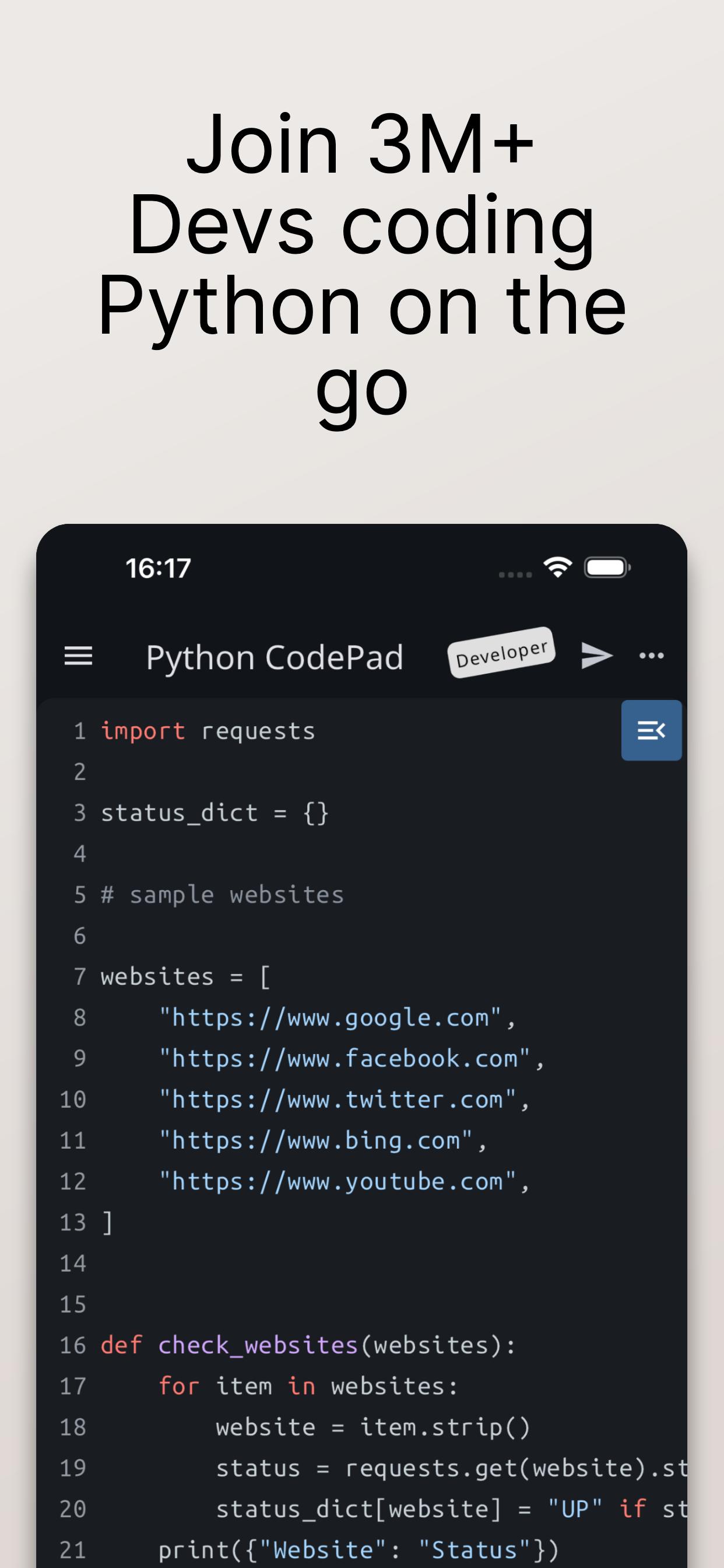 Jalankan kod Python dan pelajari Python pada Peranti mudah alih anda.