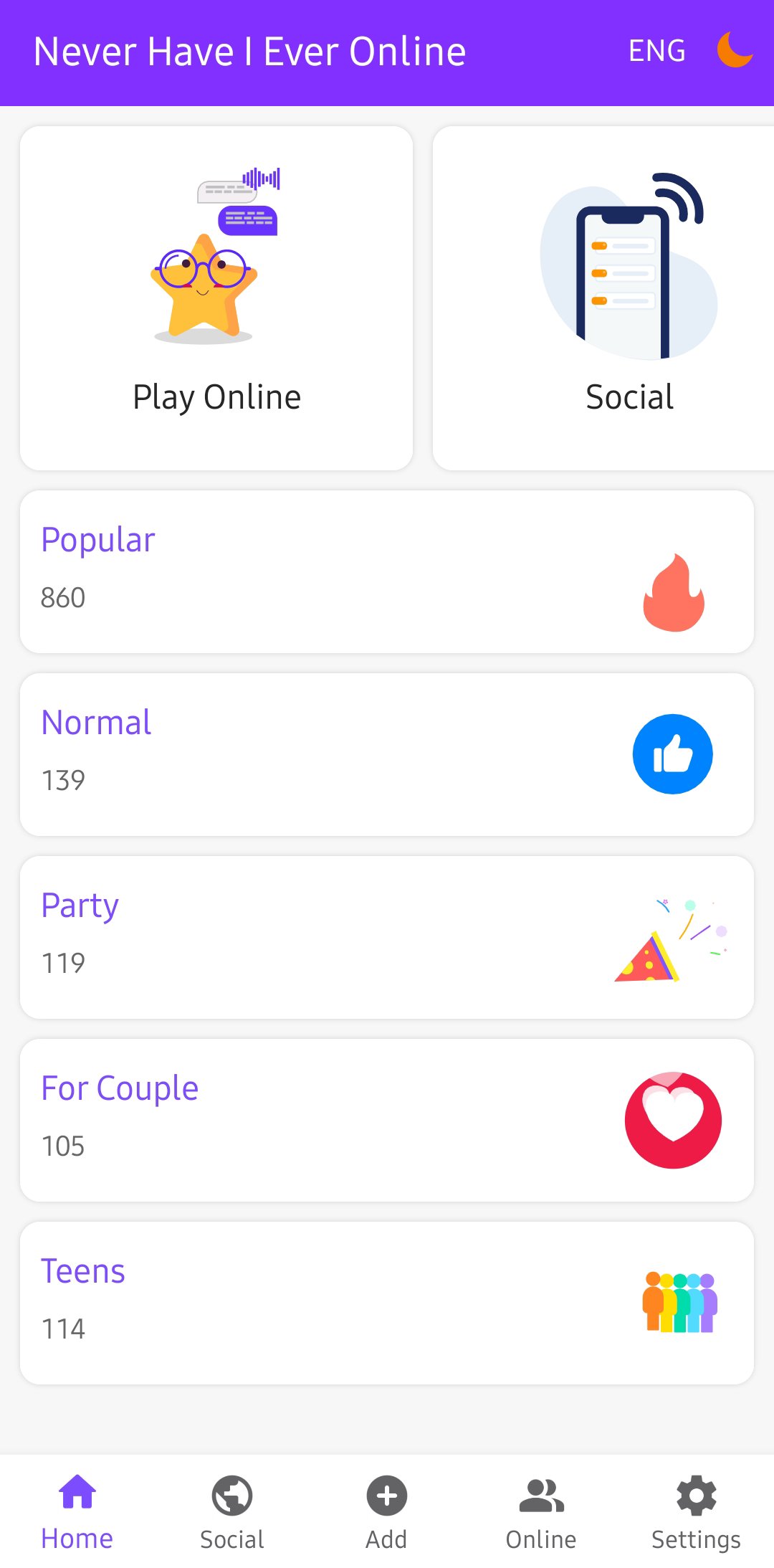 Jika anda tidak dapat bertemu rakan anda dan tidak boleh pergi ke pesta bermain dengan mereka dalam talian atau bermain dengan orang yang tidak dikenali. Cipta bilik permainan dalam talian persendirian atau awam dan jemput rakan anda, bertukar-tukar mesej dan banyak lagi... Anda boleh mencipta soalan anda sendiri dan menyimpannya , anda juga boleh berkongsi soalan Jangan Sekali-kali anda kepada kategori sosial dan kemudian sesiapa sahaja boleh menikmatinya.
