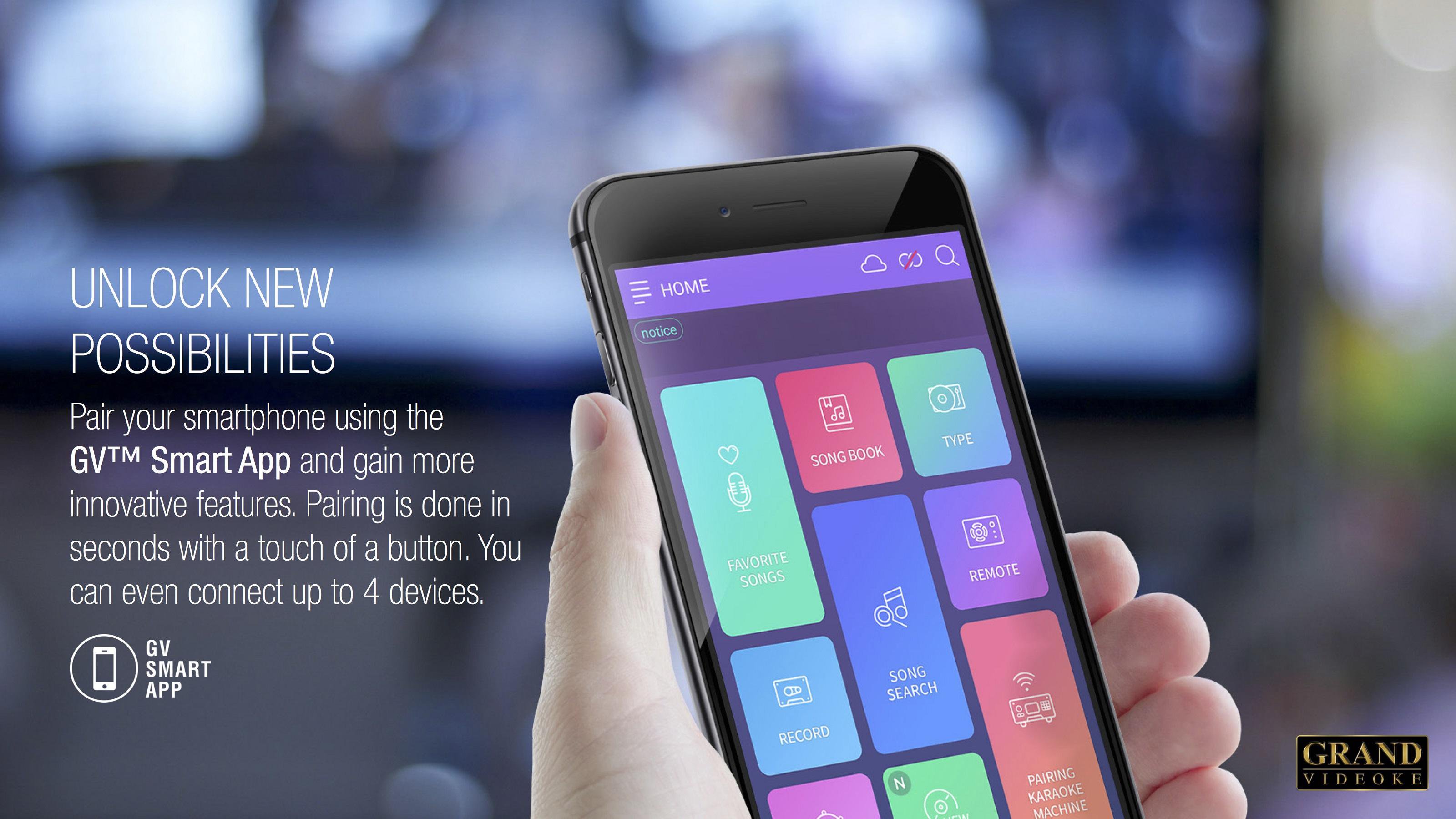Pasangkan peranti mudah alih anda menggunakan Apl Pintar GV ™ dan dapatkan lebih banyak ciri inovatif. Pairing dilakukan dalam beberapa saat dengan sentuhan butang. Anda juga boleh menyambung sehingga 4 peranti ke Grand Videoke anda pada satu masa.