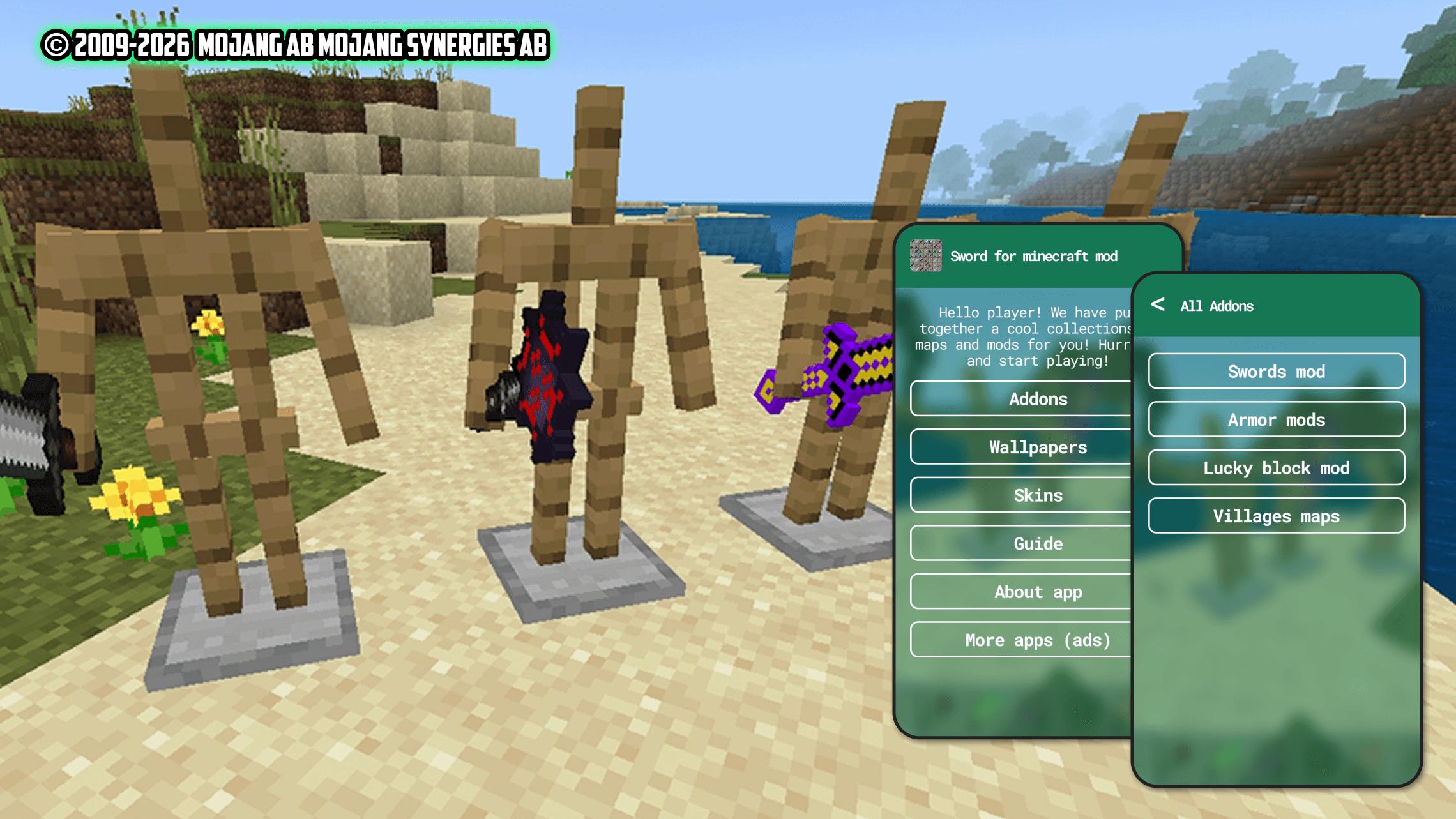 Tidak dapat mencari mod yang menarik dan berfungsi untuk minecraft 1.21? Sekarang anda tidak mempunyai masalah seperti itu dengan mencari mod untuk mcpe 1.20, kerana anda sampai ke halaman dengan katalog tambahan kami! Kini anda boleh melupakan tentang membuat jenis pedang yang biasa untuk minecraft 1.20, dan juga menambah banyak lagi bijih baharu untuk mcpe dan item berguna yang lain. Selami permainan dengan banyak pedang yang dikemas kini untuk minecraft 1.20. Selamat datang ke dunia pertempuran epik dan mod pedang legenda untuk minecraft 1.21! Aplikasi kami ialah teman sempurna anda dalam dunia kelangsungan hidup padu. Temui kekayaan dan kepelbagaian pedang untuk mcpe, daripada pedang kayu ringkas kepada bilah terpesona mistik. Apl kami direka untuk pemula dan pemain berpengalaman. Pemula akan menemui maklumat asas di sini tentang cara mendapatkan mod pedang pertama mereka untuk minecraft dan memulakan pengembaraan mereka. Dan pemain berpengalaman akan dapat memperdalam pengetahuan mereka dengan menemui kombinasi dan strategi pesona yang jarang berlaku untuk pertempuran PvP.