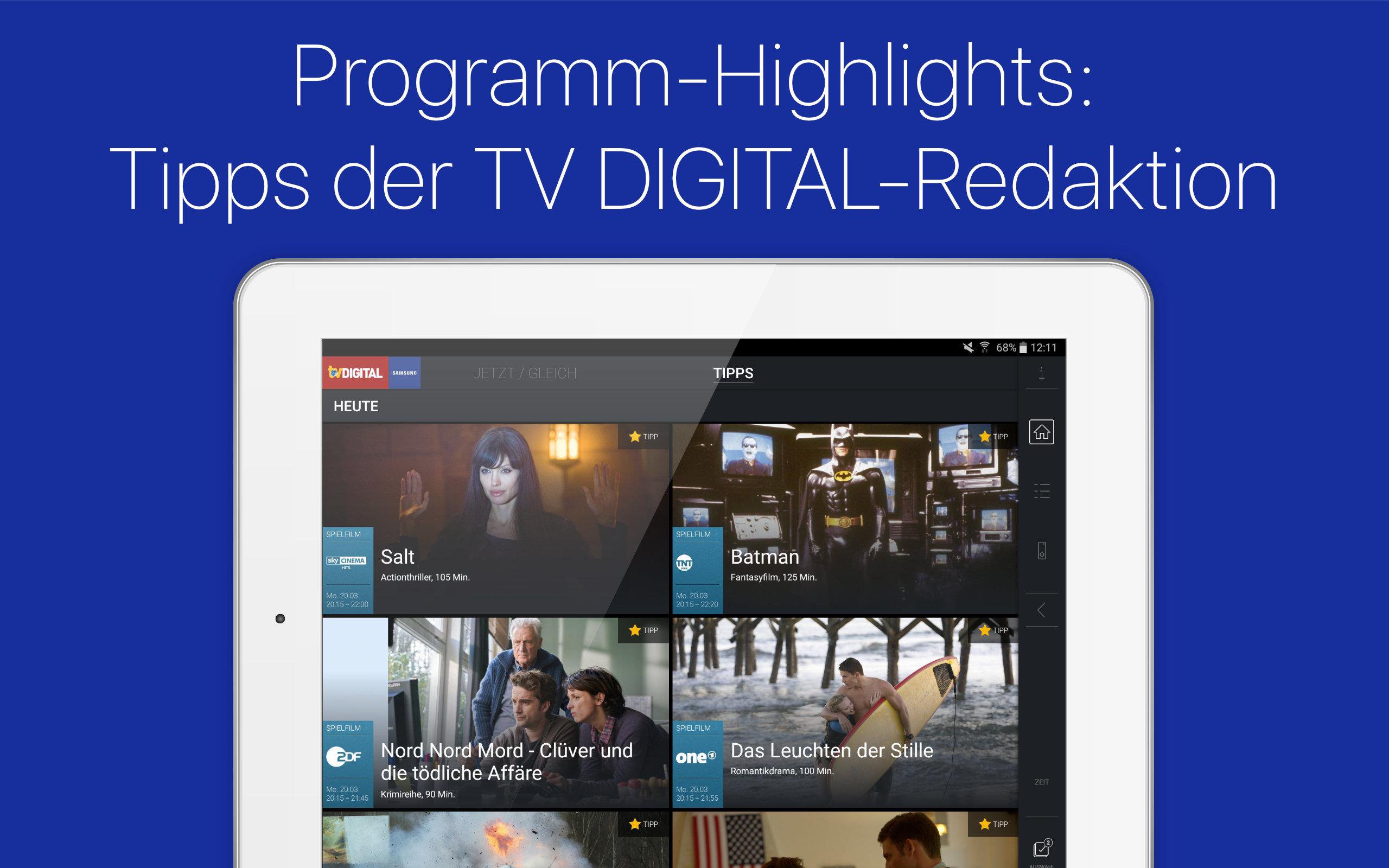 Dengan aplikasi TV DIGITAL Samsung anda boleh bukan sahaja dalam program TV menyemak imbas, tetapi suis bimbit anda di televisyen dan menonton program yang sama dalam program semasa. Selepas membuka aplikasi yang sedang anda melayari secara langsung dalam program ini, mencari inspirasi TV Tips TV DIGITAL editorial dan jelas di satu pihak semua program yang kini menjalankan program ini dan mereka yang bermula sebentar lagi.