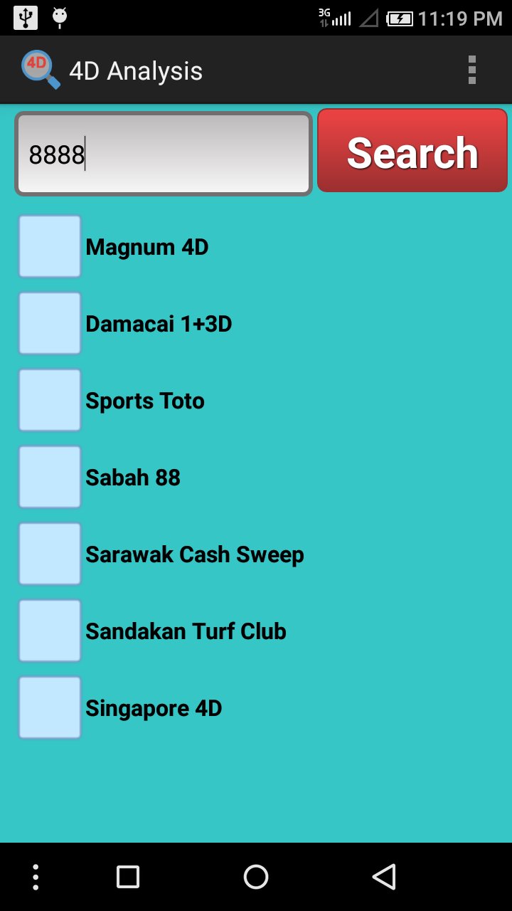 Aplikasi ini adalah untuk anda mencari hasil sejarah Malaysia dan Singapura 4D. ia juga termasuk menganalisis untuk memenangi kebarangkalian.