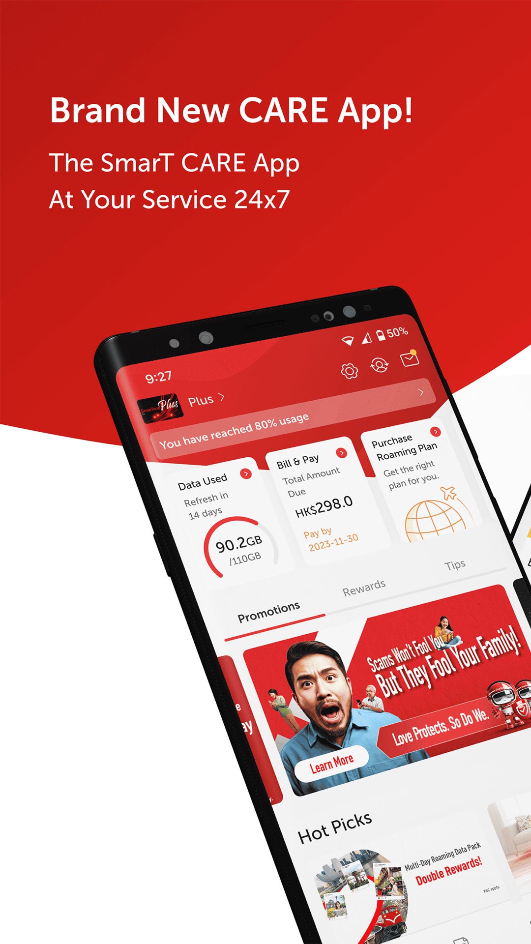 Apl CARE yang dinaik taraf serba baharu membolehkan pengguna menyesuaikan antara muka mereka, mengikuti perkembangan terkini dengan tawaran eksklusif, ganjaran terpilih dan berita terkini. Pelanggan SmarTone juga boleh menikmati pelbagai perkhidmatan prihatin seperti beratur jauh, penyewaan powerbank percuma, tempahan perkhidmatan pemindahan data dan banyak lagi!