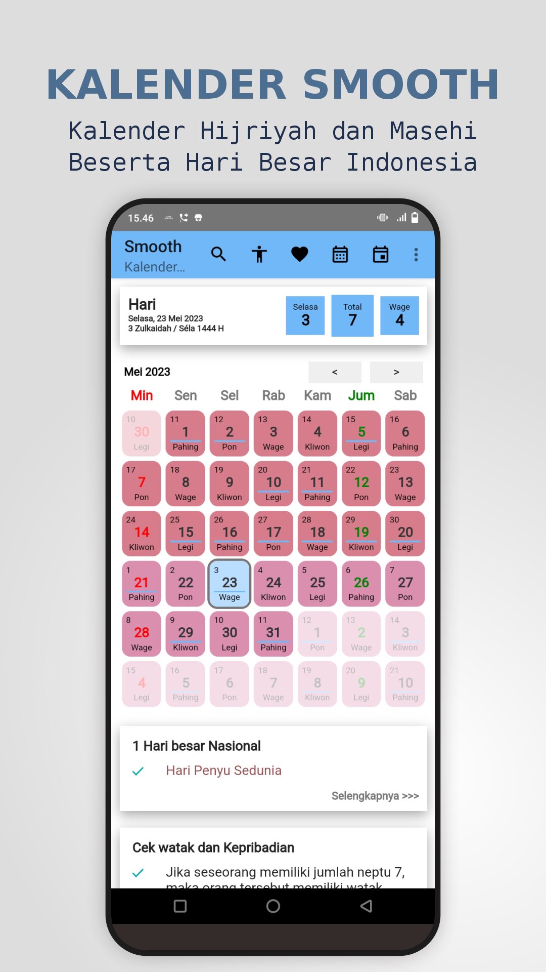 Dengan aplikasi ini, kamu bisa dengan mudah mengetahui tanggal dan hari dalam kalender Hijriyah dan Masehi, serta hari libur nasional Indonesia. Kamu juga bisa mengetahui watak dan wetonmu berdasarkan nama dan tanggal lahir, dan mengetahui tingkat kecocokanmu dengan pasanganmu berdasarkan astrologi.