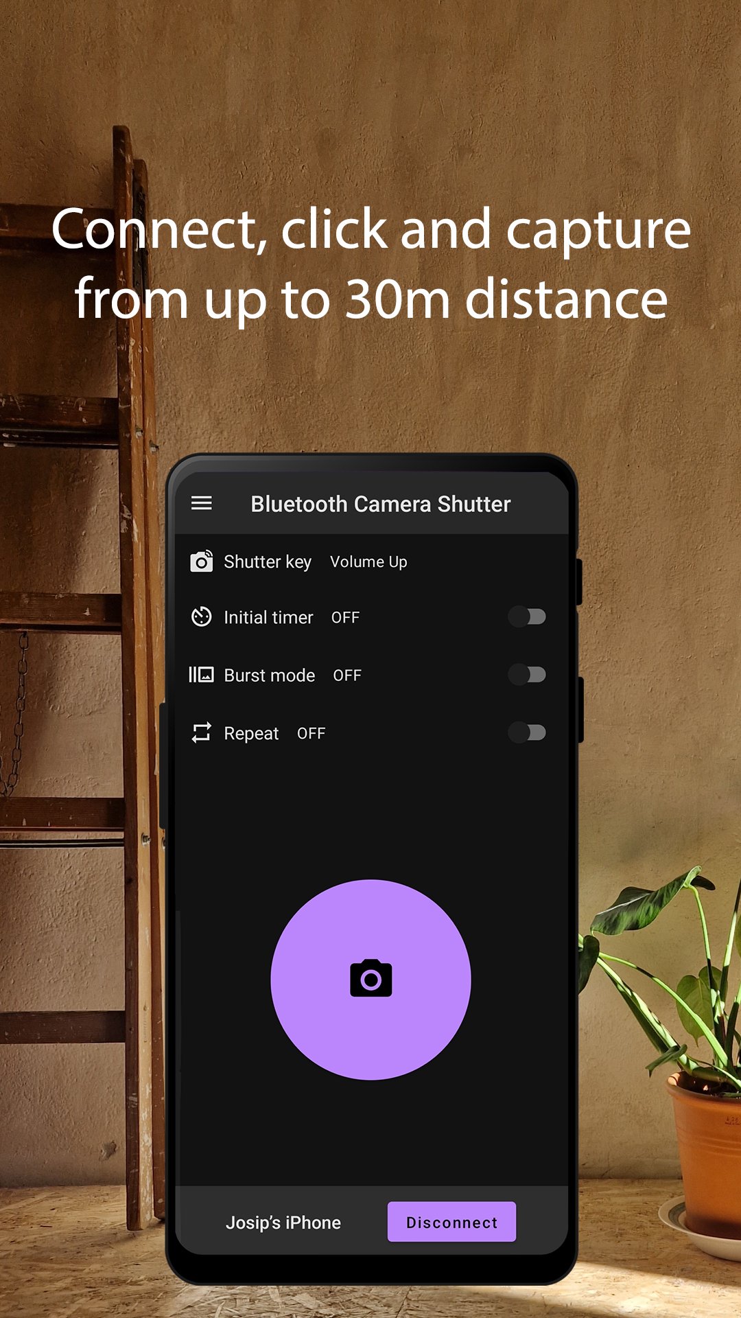 Apl ini sesuai untuk merakam momen bersama atau mengambil swafoto yang sempurna. Tiada lagi regangan lengan yang janggal atau meminta orang yang tidak dikenali untuk mengambil foto anda. Dengan Pengatup Kamera Bluetooth, anda boleh meletakkan kamera anda dan menangkap foto yang sempurna dengan lebih pantas dan lebih baik berbanding sebelum ini.