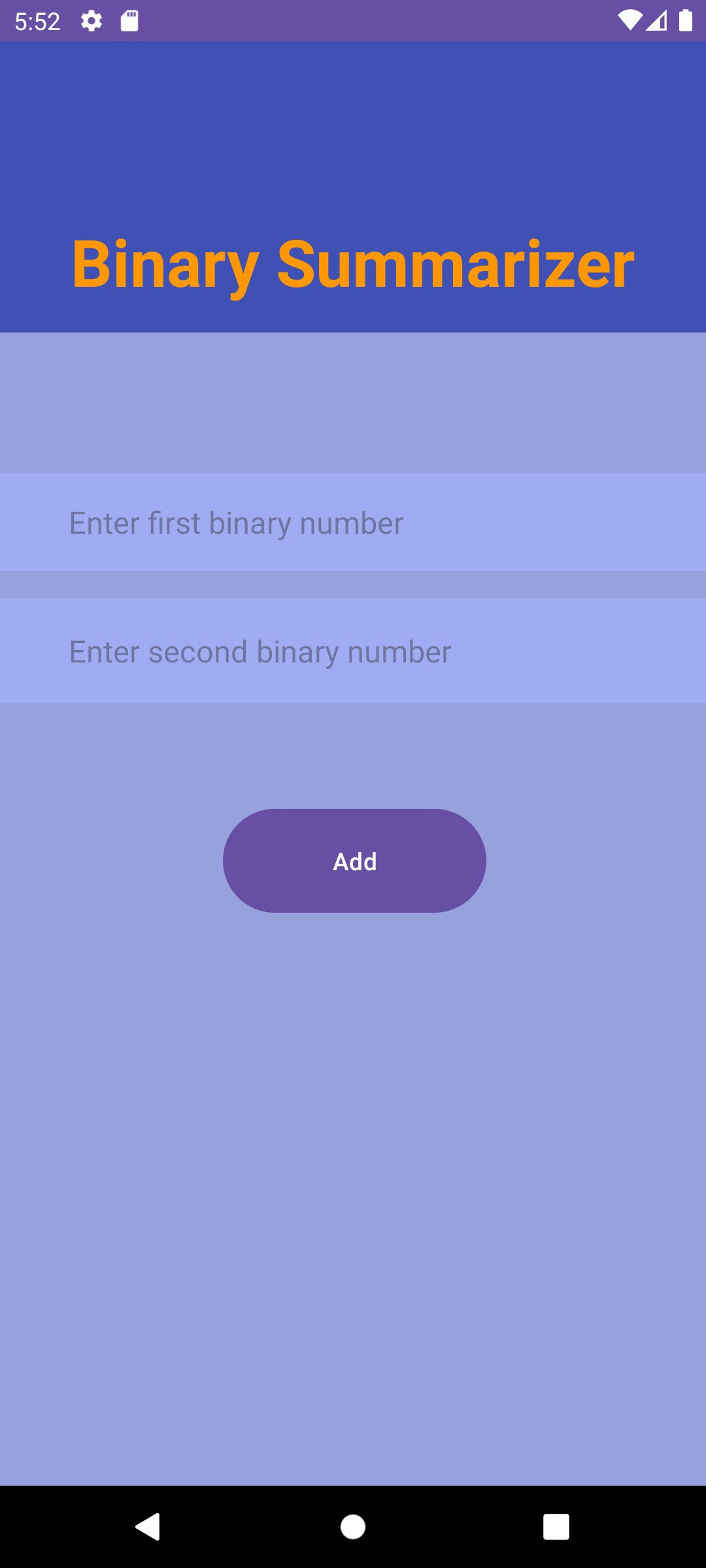 Tambah nombor binari dengan mudah dengan Binary Summarizer! Masukkan dua digit perduaan dan serta-merta melihat hasilnya dalam pop timbul yang mudah dalam apl. Permudahkan pengiraan binari anda sekarang dengan aplikasi yang mudah digunakan ini!