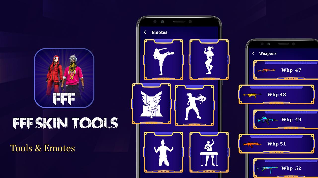 FFF Skin Tool & FFF FF Emotes app is a simple and no cost app that allows users to entertain by getting Elite Pass Bundles, Emotes, favorite characters & Gun Skins.