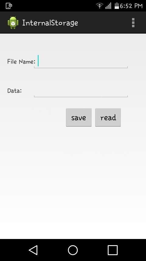 Dengan aplikasi ini, anda boleh menyimpan dan membaca data fail aplikasi storage.This dalaman direka untuk menyimpan dan membaca data storan dalaman.
