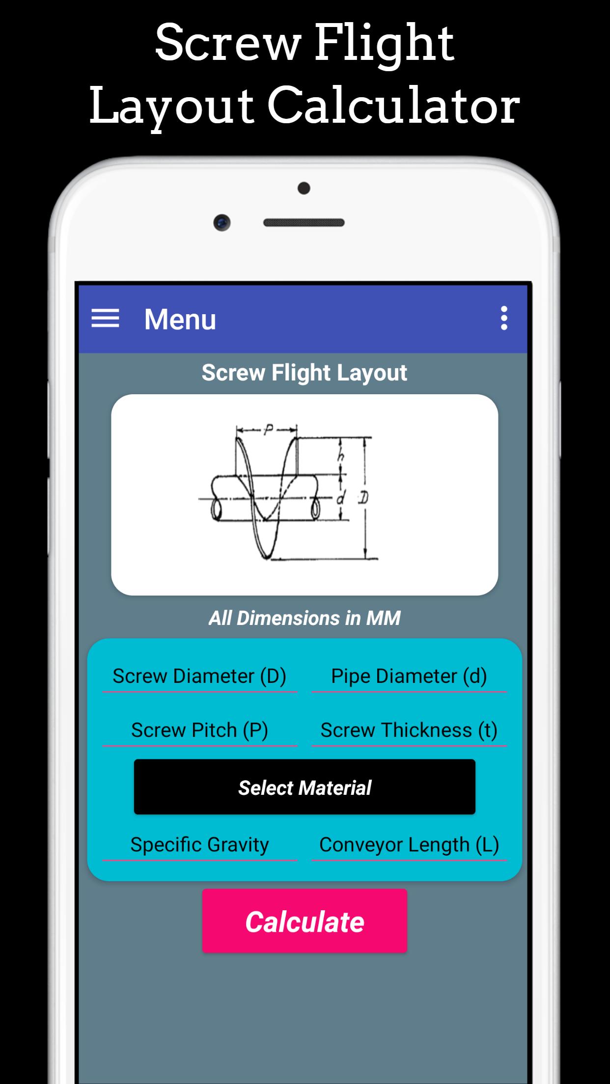 Dalam Input Aplikasi ini Diperlukan Di Luar & Di dalam Diameter Skru, pitch penerbangan, ketebalan bahan & graviti spesifik Bahan Pembinaan seperti keluli karbon, Keluli tahan karat, tembaga, Tembaga atau bahan Gangsa.