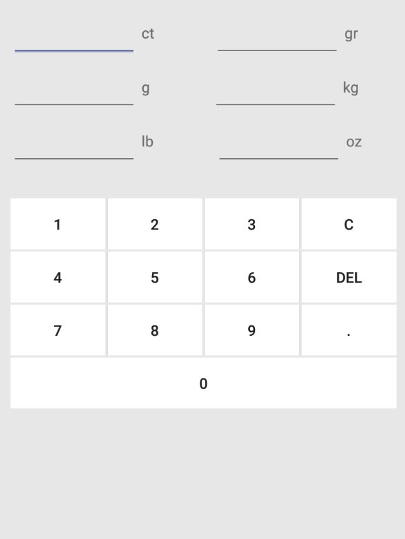 Aplikasi ini mengubah unit berat dari ct, gr, g, kg, lb, dan oz ke unit lainnya.