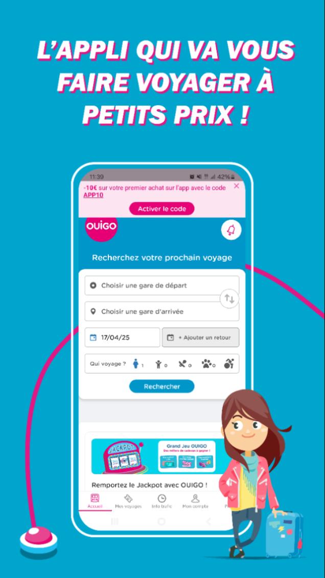 Sediakan kedua-dua kehidupan harian anda dan percutian anda dengan aplikasi OUIGO. Untuk perjalanan perniagaan anda atau percutian anda di Perancis, tempah tiket kereta api kos rendah & TGV anda. Dengan OUIGO, tawaran kos rendah daripada SNCF Voyageurs, tempah tiket anda 100% dalam talian dan perjalanan pada harga rendah dengan Kereta Api Berkelajuan Tinggi dan Kereta Api Klasik ke lebih daripada 60 destinasi di Perancis.