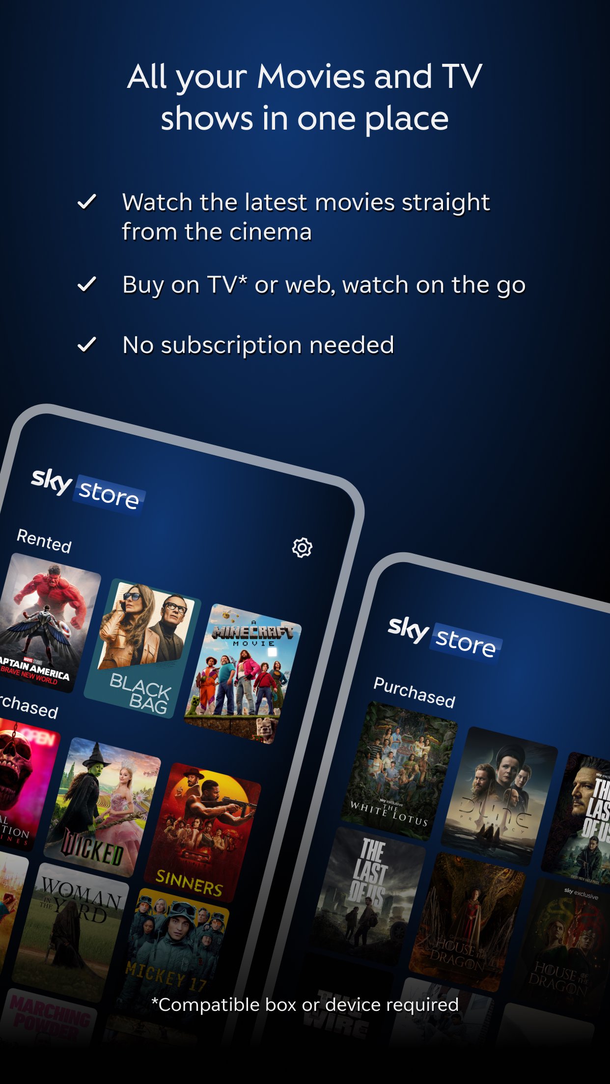 Dengan Sky Store, anda boleh membeli atau menyewa pada TV yang serasi, Sky box atau melalui tapak web Sky Store dan menonton pada peranti mudah alih anda pada bila-bila masa, di mana-mana sahaja. Tiada langganan Sky TV diperlukan.