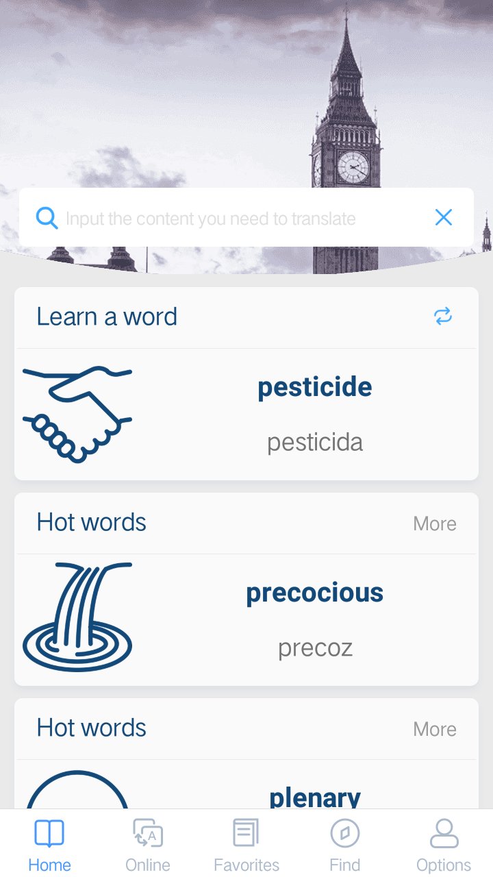 The dictionary supports both offline and online translation, automatic retrieval of Chinese and English input, easy to use, support Chinese. English. Japanese. Korean. French. German. Spanish online translation and pronunciation, support English online listening learning