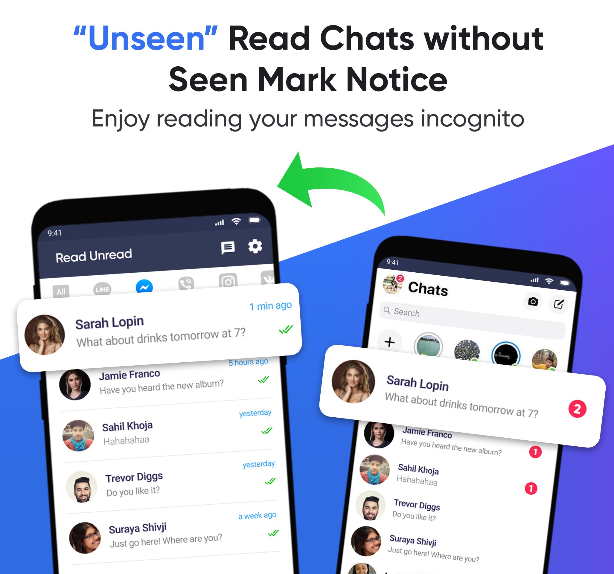 Wanna read chat without seen? A new facebook messanger incognito app which will allow you hide seen status facebook and read deleted messages on facebook, whatsapp or any messanger. Its time to get unseen messenger application and regain that privacy in messages incognito that could have been on the web before. This application gives you complete freedom to hide seen status at any messanger and reed any messages without blue ticks or seen notices. This app will allow you view messages without seen at in all popular instant messengers such as Instagram WhatsApp Messenger Line VK and others.