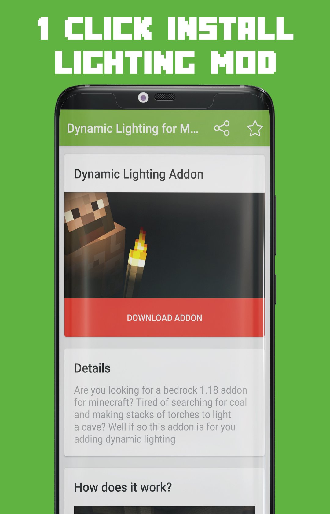 Dynamic Light Mod for Minecraft PE is an application that allowed you to easily download & install Dynamic Lighting Add-on to Minecraft Pocket Edition game in your Android devices. Thanks to our 1-Click installer that make it super easy to install Minecraft Mods, Addons, Maps, Skins, and Texture Packs.