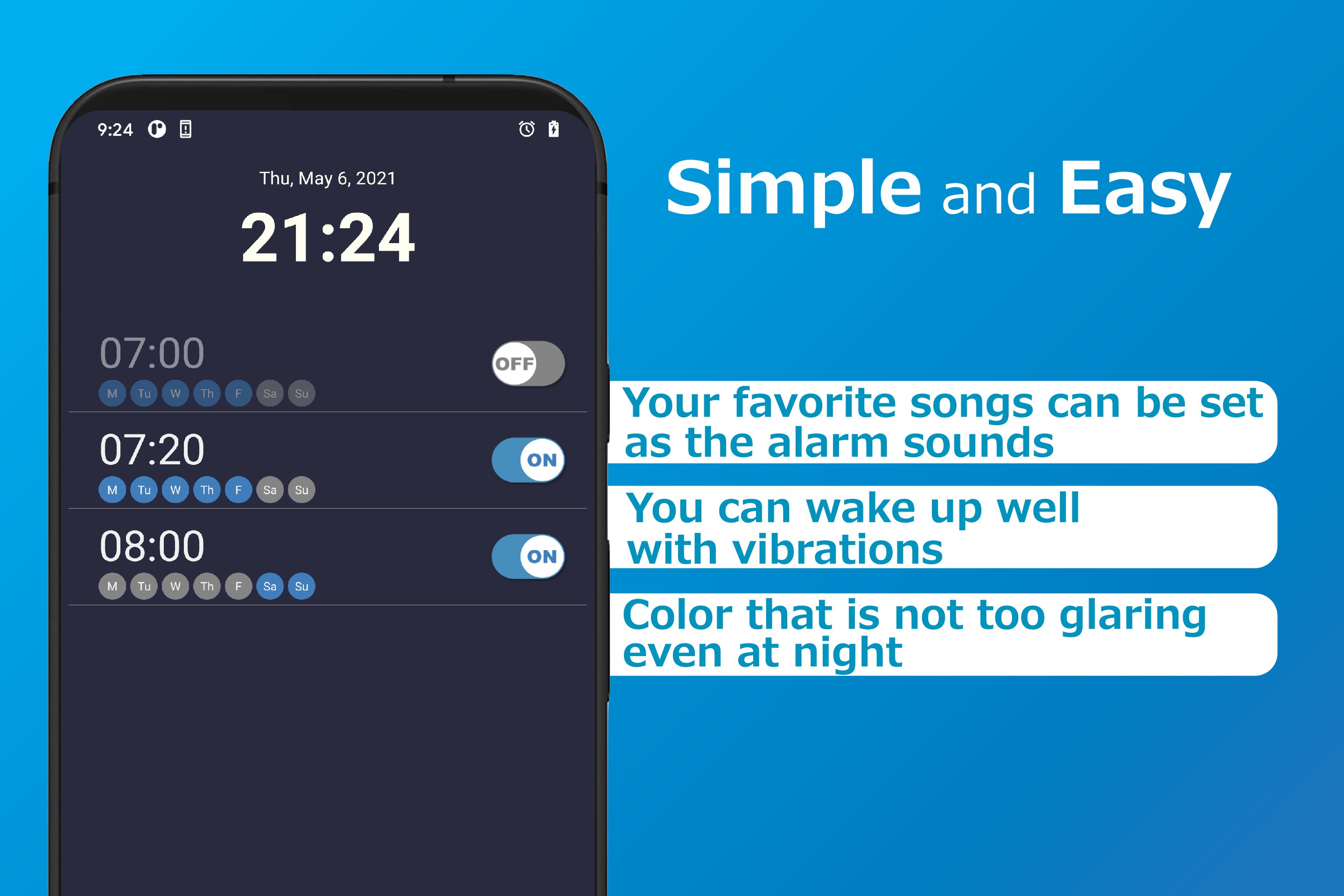 We made sure to design this app to be easy to use because you'll be using it every day. It is outfitted with great basic features like setting your favorite song as your alarm, without overloading it with excessive functions that you'll never use.