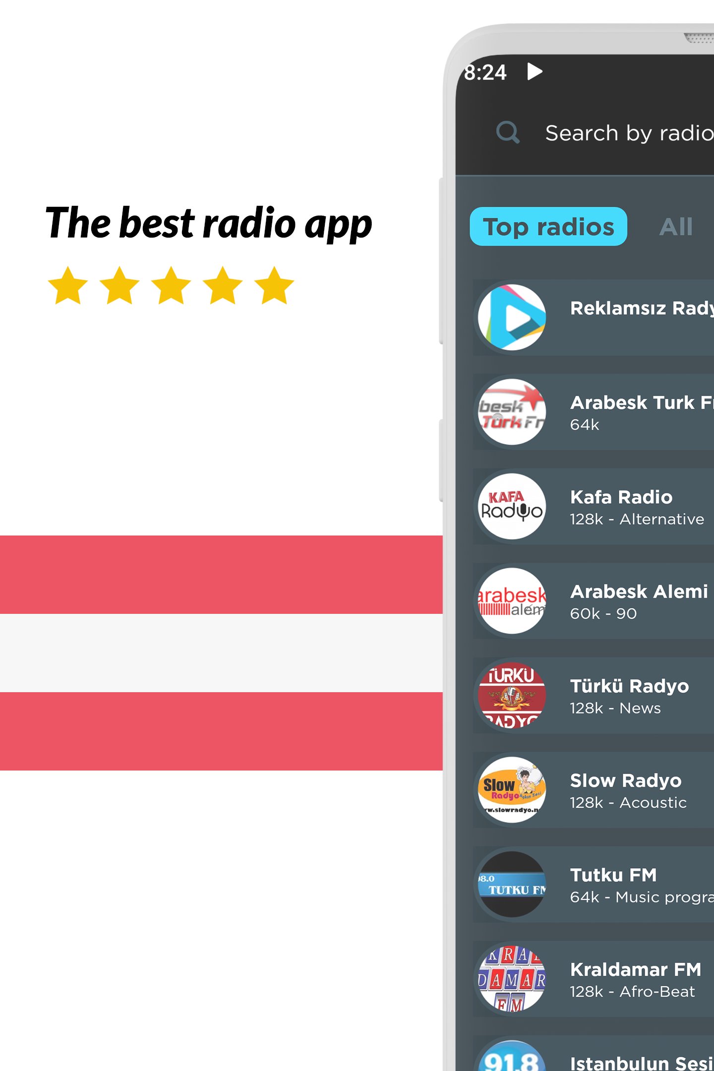Listen to all your favorite radio stations like Aşk, KRAL, DarTürk, Fenomen, Türkü, Ankara Havaları, Metro, Slow Türk, Arabesk Dar, Baba, Süper, Park, 98.2 Karadeniz, 7, Seymen and many more! And no matter what city or country you are in, you can listen to your favorite local radio station from anywhere in the world!