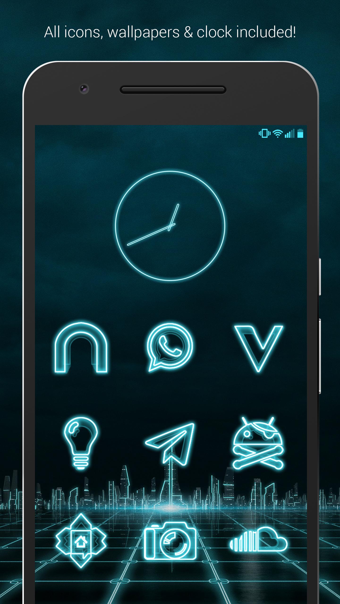 The Grid (Free Version) is a neon blue/teal theme with a focus on Sci-Fi aesthetics with digital 3D renderings of futuristic backgrounds. Glowing neon blue futuristic sci-fi Icons have transparency to blend in well with your backgrounds. Icons also feature a 3D looks and handmade designs. Custom wallpapers have variations in darkness for you to experiment with, or use your own backgrounds to create your own futuristic theme.