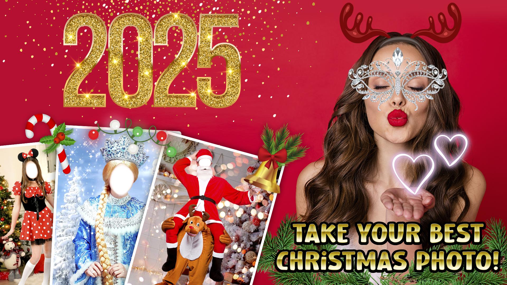🎁 Xmas hats: Top off your look with Santa xmas hats or sparkling reindeer headbands with Face in Hole frame.