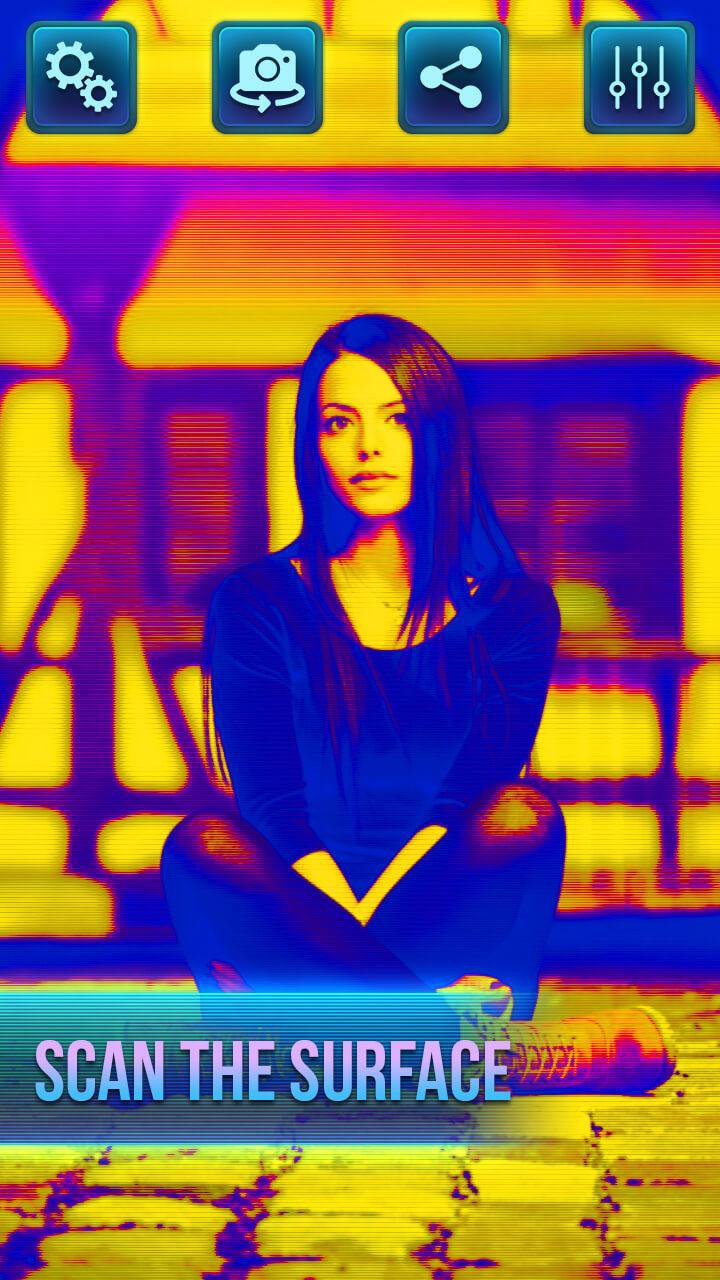 Do you want to see what others dont? Do you like has always been light in the room? Look beyond the familiar world with the UV Flashlight Camera Simulator app. Download the simulator, directs light to object of desire or the room and watch what is hidden from view. Learn how to look the same objects in the ultraviolet or infrared light, when them illuminated halogen or neon lamps. Check the UV suspicious banknote authenticity, identify oil leaking in the fathers car, use a flashlight when cleaning the room. Turn on infrared night vision equipment for the dark observation or to keep track of various temperature zones in the house and on the street. Unlock the secrets around. Learn a lot of new and have fun with friends.