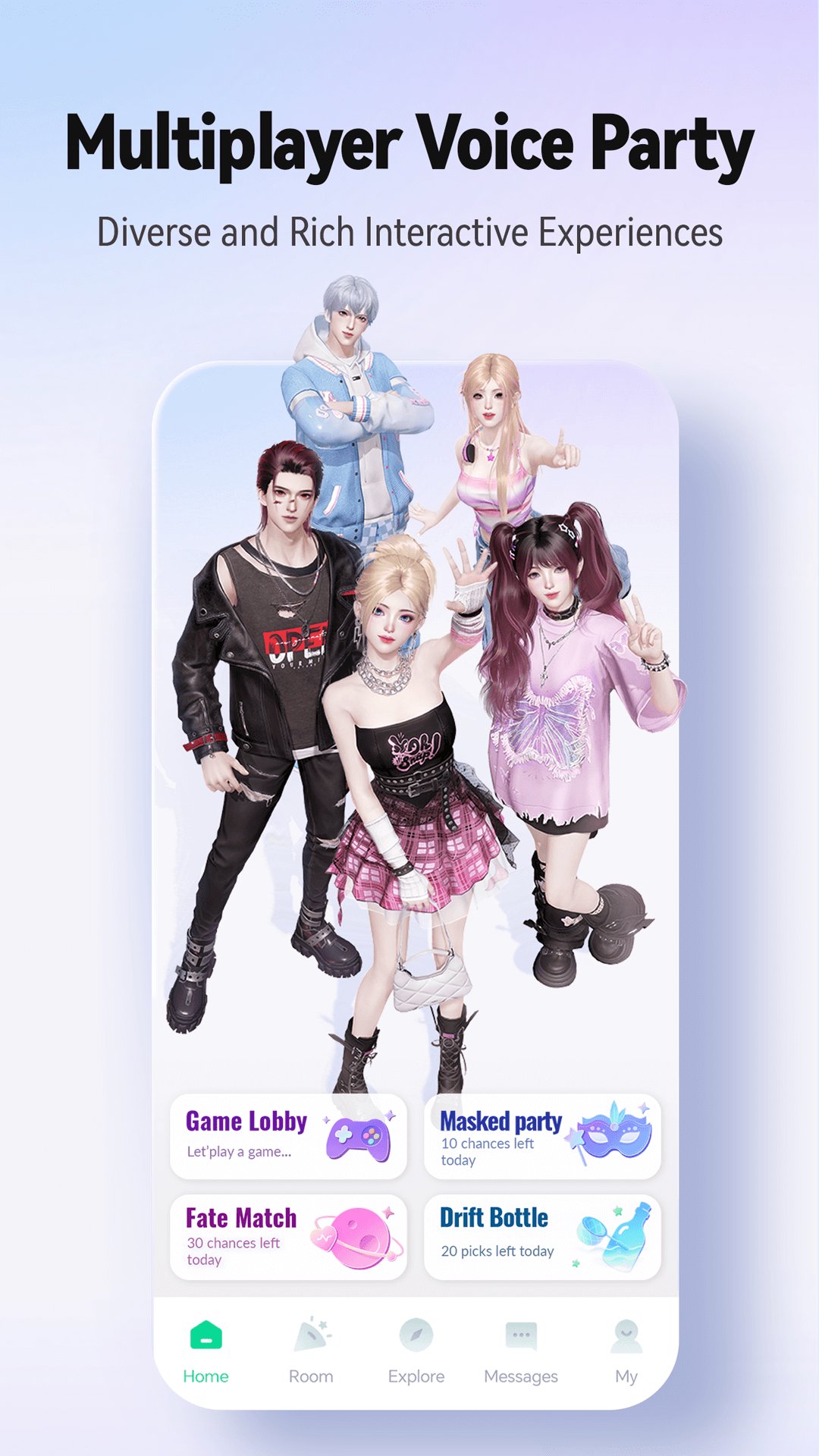 Design your ideal social room, controlling everything from layout to atmosphere. Invite friends to join your online party, making each room a unique space for interacting, sharing, and laughing together.