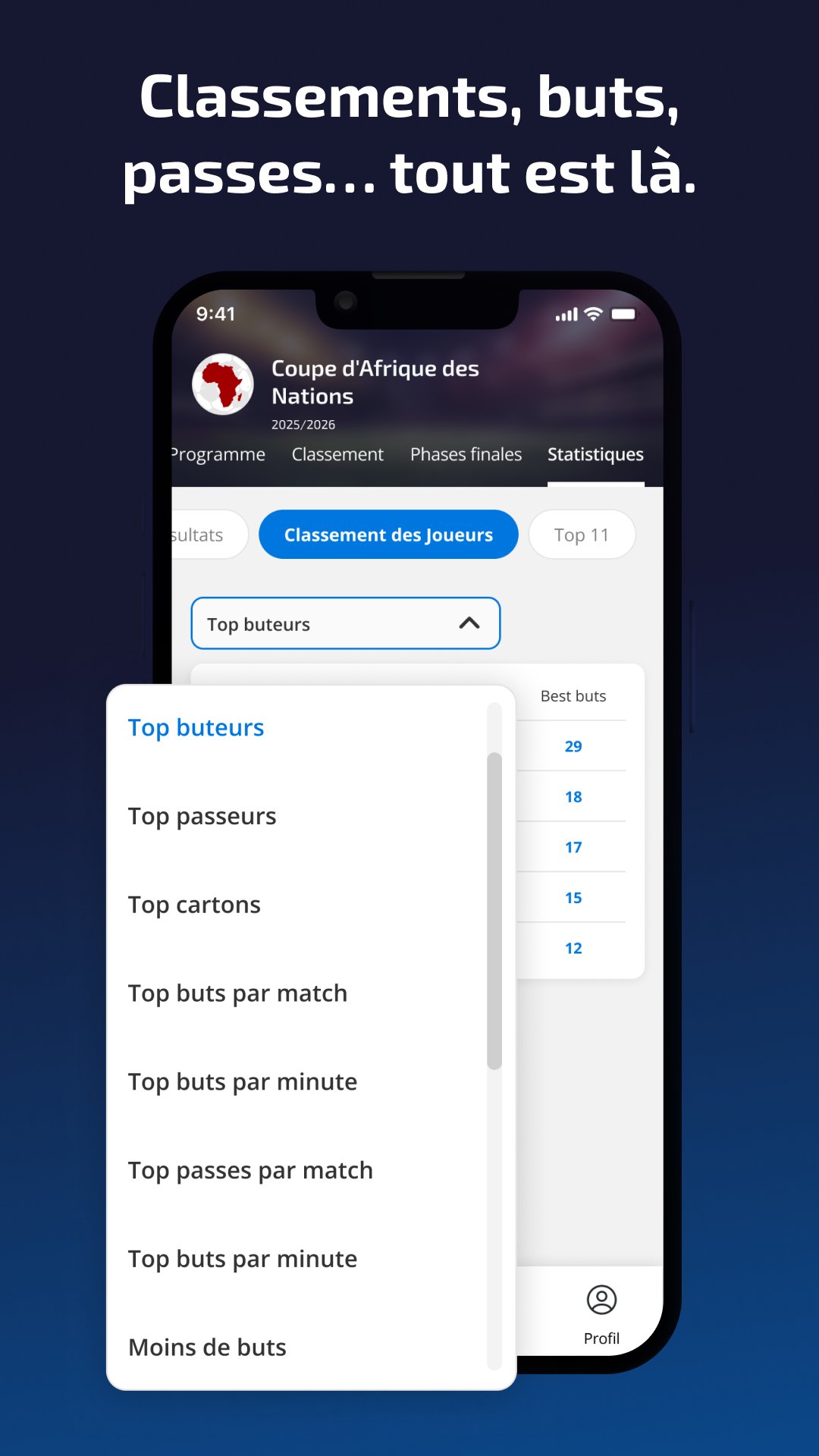 Clicnscores is the essential app for following the Africa Cup of Nations live. Find all the matches, scores, standings, statistics, videos, podcasts, and AFCON news in a modern, fast, and intuitive interface.