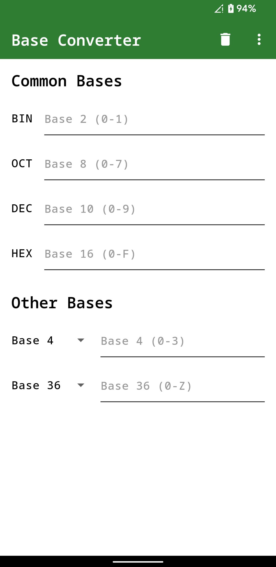 - Tap a dropdown in the Other Bases section to pick a custom base from 2 to 36. The number in all text fields will change accordingly.