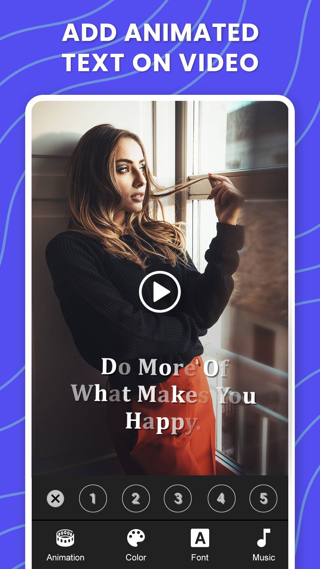 Add text to video with animation with this video editor Text on video app. Make video of your moments or import from gallery to start edit video by add text on video with text fonts, animations & music. Text on video & photo app provides lots of text fonts, music, text animations, text color to edit your video. Make a awesome video with animated text and music.