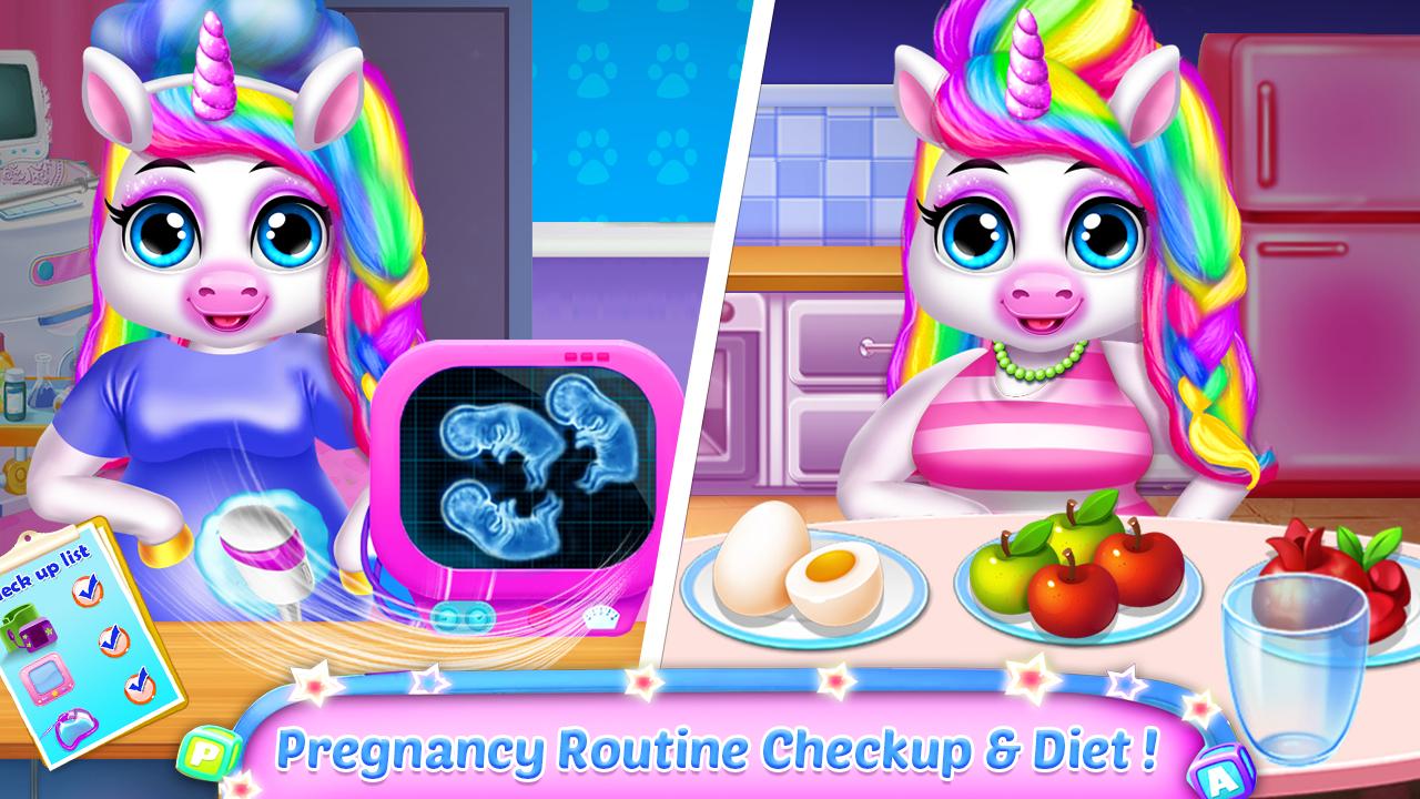 Mommy Pregnancy Unicorn give birth newborn Baby Caregiver and maternity care games for girls. Pregnant teen mom care needs some safety and nutrition to stay healthy throughout nine months before giving birth triplet babies game for kids. Expected girls need healthy mix of foods like complex carbohydrates, protein, vegetables, fruits, grains and healthy fats, vitamins and minerals, folic acid and zinc. Unicorn Regular medical visits and checkups are important in trimester like monitor the healthy baby development for a prenatal checkup includes ultrasounds, oxygen mask, bp checking, heart beat, glucose and diabetes tests in babysitter apps. Educational activities like coloring by numbers, shapes draw and diapers art work. Reservation to a hair dressing salon for your cute newborns to look more cute tycoon in upcoming events.